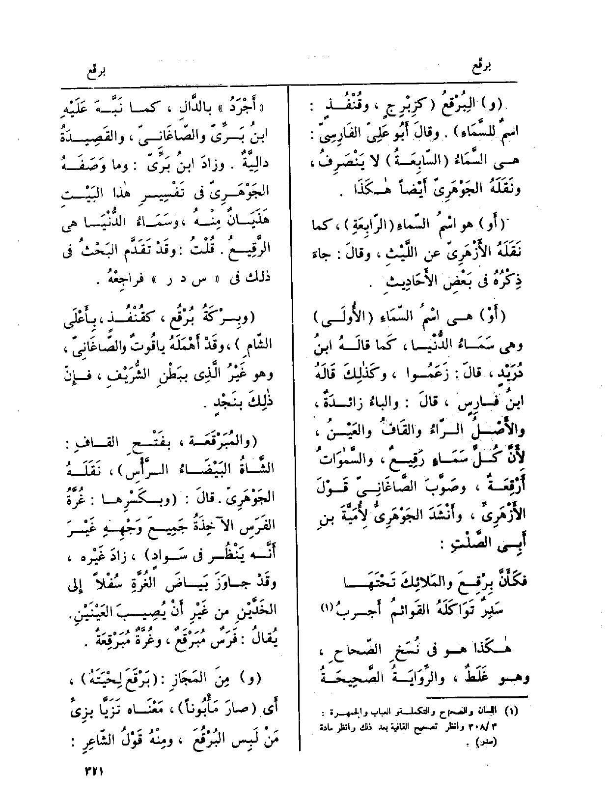 والبُرْقعُ كزِبْرِجٍ، وقُنْفُذٍ: اسْمٌ للسَّمَاءِ. وقالَ أَبُو عَلِيّ الفَارِسِيّ: هِيَ السَّمَاءُ السّابِعَةُ لَا يَنْصَرِفُ، ونَقَلَهُ الجَوْهَرِيّ أَيْضاً هكَذَا. أَو هُوَ اسْمُ السّماءِ الرّابِعَةِ، كَمَا نَقَلَهُ الأَزْهَرِيُّ عَن اللَّيْثِ، وقالَ: جاءَ ذِكْرُهُ فِي بَعْضِ الأَحَادِيثِ. أَوْ هِيَ اسْمُ السّمَاءِ الأُولَى وَهِي سَمَاءُ الدُّنْيا، كَما قالَهُ ابْنُ دُرَيْدٍ، قالَ: زَعَمُوا، وكَذلِكَ قَالَهُ ابنُ فارِسٍ، قالَ: والباءُ زائدَةٌ، والأَصْلُ الرّاءُ والقَافُ والعَيْنُ، لأَنَّ كُلَّ سَمَاءٍ رَقِيعٌ، والسَّمَواتُ أَرْقِعَةٌ، وصَوَّبَ الصّاغَانِيّ قَوْلَ الأَزْهَرِيِّ، وأَنْشَدَ الجَوْهَرِيُّ لأُمَيَّةَ بنِ أَبِي الصَّلْتِ: