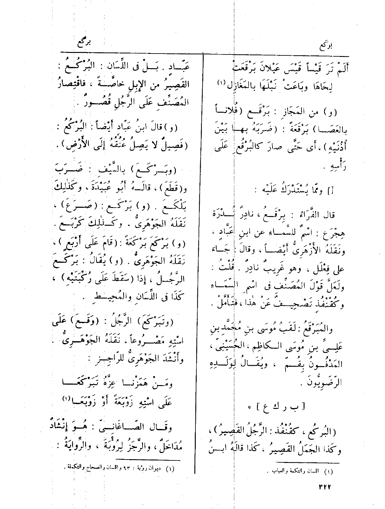 البُركُع، كقُنْفُذ: الرَّجُلُ القَصِيرُ، وكَذا الجَمَلُ القَصِيرُ، كَذا قالَهُ ابنُ عَبّادٍ. بَلْ فِي اللِّسَان: البُرْكُعُ: القَصِير من الإِبِلِ خاصَّةً، فاقْتِصارُ المُصَنِّفِ عَلَى الرَّجُلِ قُصُورٌ.