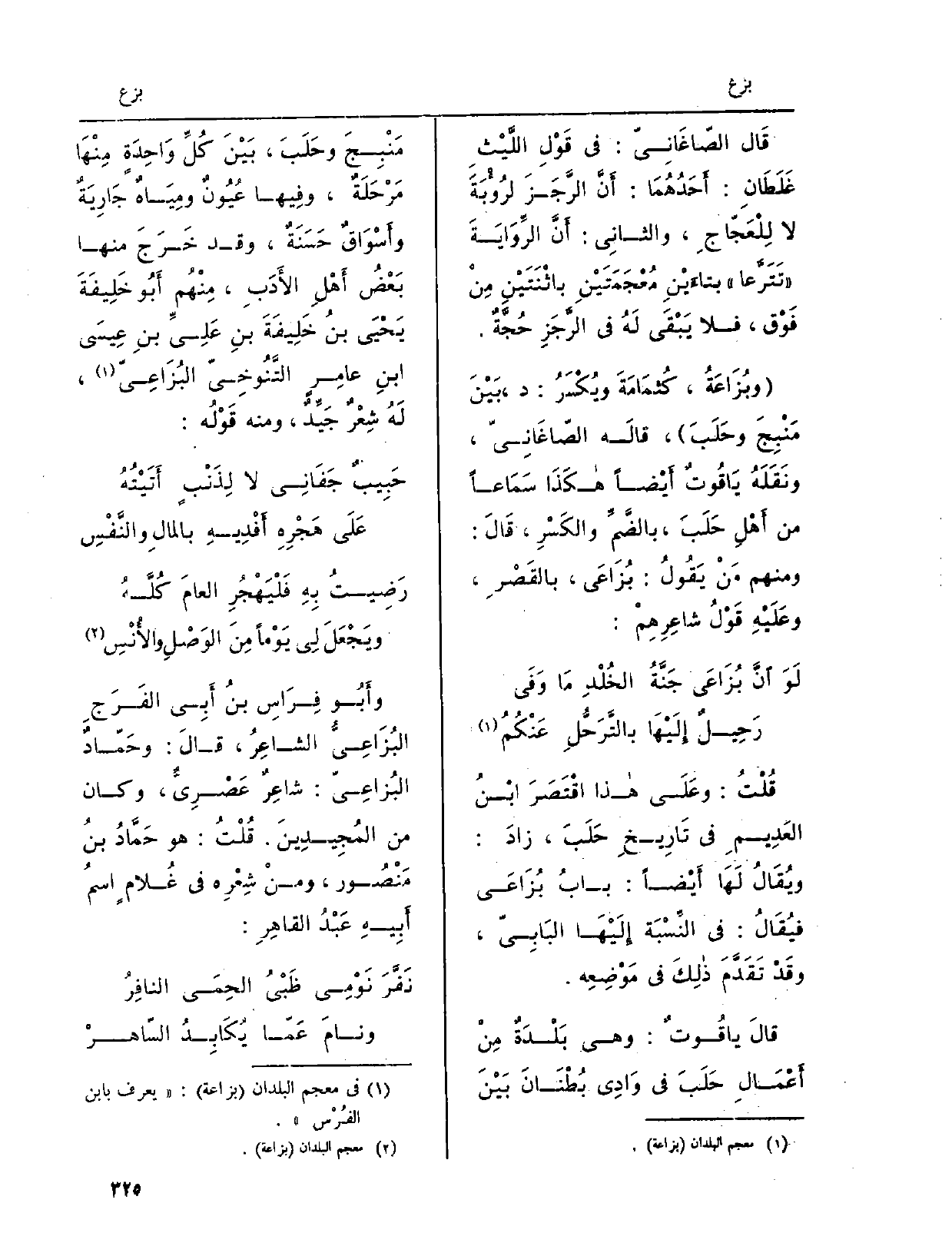 قُلْتُ: وعَلَى هَذَا اقْتَصَرَ ابْنُ العَدِيمِ فِي تَارِيخِ حَلَبَ، زادَ: ويُقَالُ لَهَا أَيْضاً: بابُ بُزَاعَي فيُقَالُ: فِي النِّسْبَة إِلَيْهَا البَابِيّ، وقَدْ تَقَدَّمَ ذلِكَ فِي مَوْضِعِه. قالَ ياقُوتٌ: وَهِي بَلْدَة مِنْ أَعْمَالِ حَلَبَ فِي وَادِي بُطْنَانَ بَيْنَ مَنْبِجَ وحَلَبَ، بَيْنَ كُلِّ وَاحِدَةٍ مِنْهَا مَرْحَلَةٌ، وفِيها عُيُونٌ ومِيَاهٌ جَارِيَةٌ وأَسْوَاقٌ حَسَنَةٌ، وَقد خَرَجَ مِنْهَا بَعْضُ أَهْلِ الأَدَبِ، مِنْهُم أَبُو خَلِيفَةَ يَحْيَى بنُ خَلِيفَةَ بنِ عَلِيِّ بنِ عِيسَى ابنِ عامِرٍ التَّنُوخِيّ البُزَاعِيّ، لَهُ شِعْرٌ جَيِّدٌ، وَمِنْه قَوْلُه: