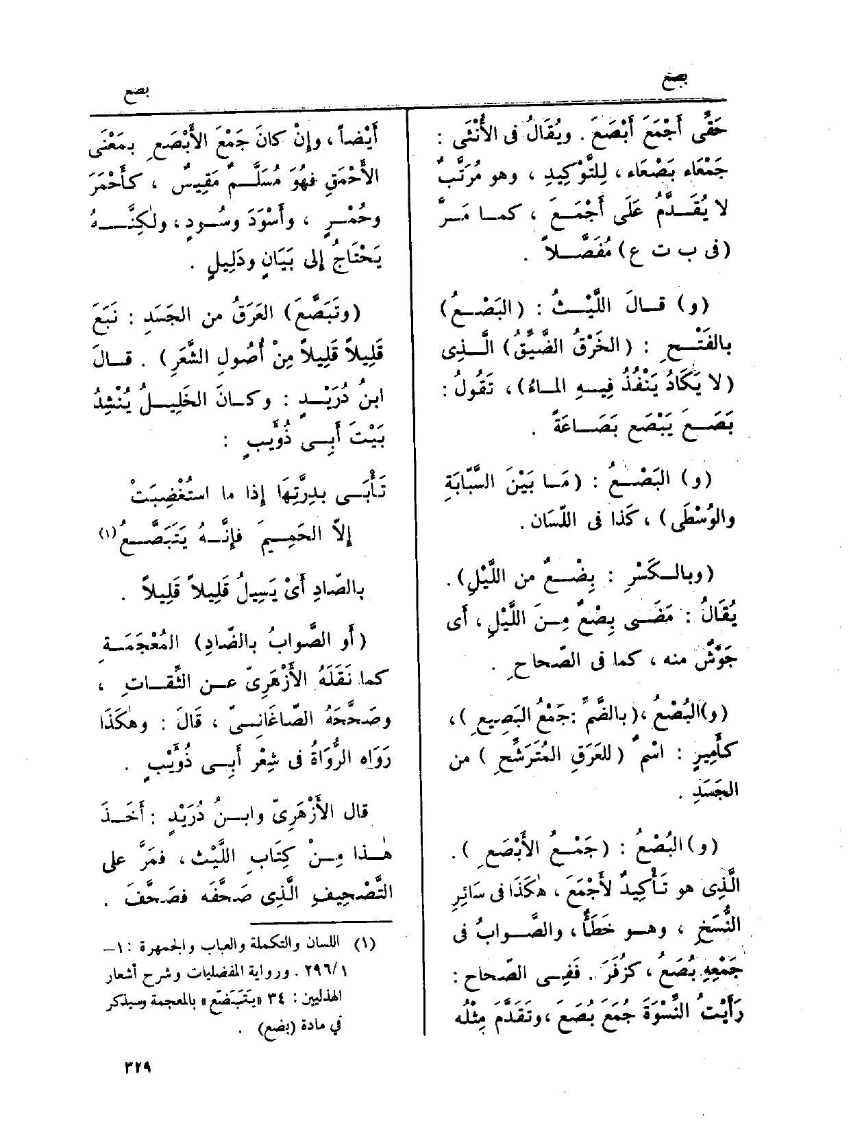 وتَبَصَّعَ العَرَقُ من الجَسَدِ: نَبَعَ قَلِيلاً قَلِيلاً مِنْ أُصُولِ الشَّعَرِ. قالَ ابنُ دُرَيْدٍ: وكانَ الخَلِيلُ يُنْشِدُ بَيْتَ أَبِي ذُؤَيْبٍ: