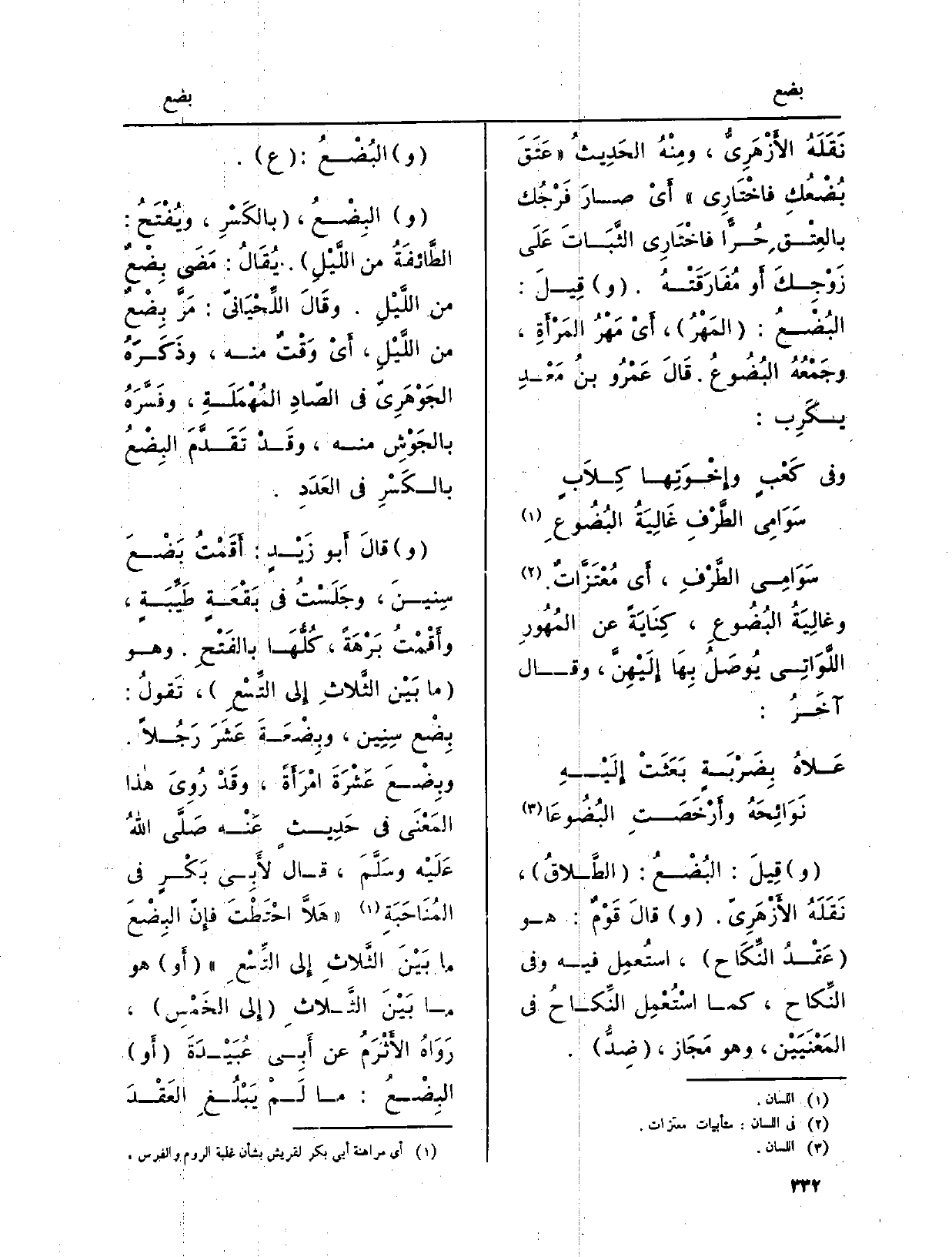 نَقَلَهُ الأَزْهَرِيُّ، ومِنْهُ الحَدِيثُ عَتَقَ بُضْعُكِ فاخْتَارِي أَيْ صارَ فَرْجُك بالعِتْقِ حُرّاً فاخْتَارِي الثَّبَاتِ عَلَى زَوْجِكَ أَوْ مُفَارَقَتْهُ. وقِيلَ: البُضْعُ: المَهْرُ، أَيْ مَهْرُ المَرْأَةِ، وجَمْعُهُ البُضُوعُ. قَالَ عَمْرُو بنُ مَعْدِ يكَرِب: