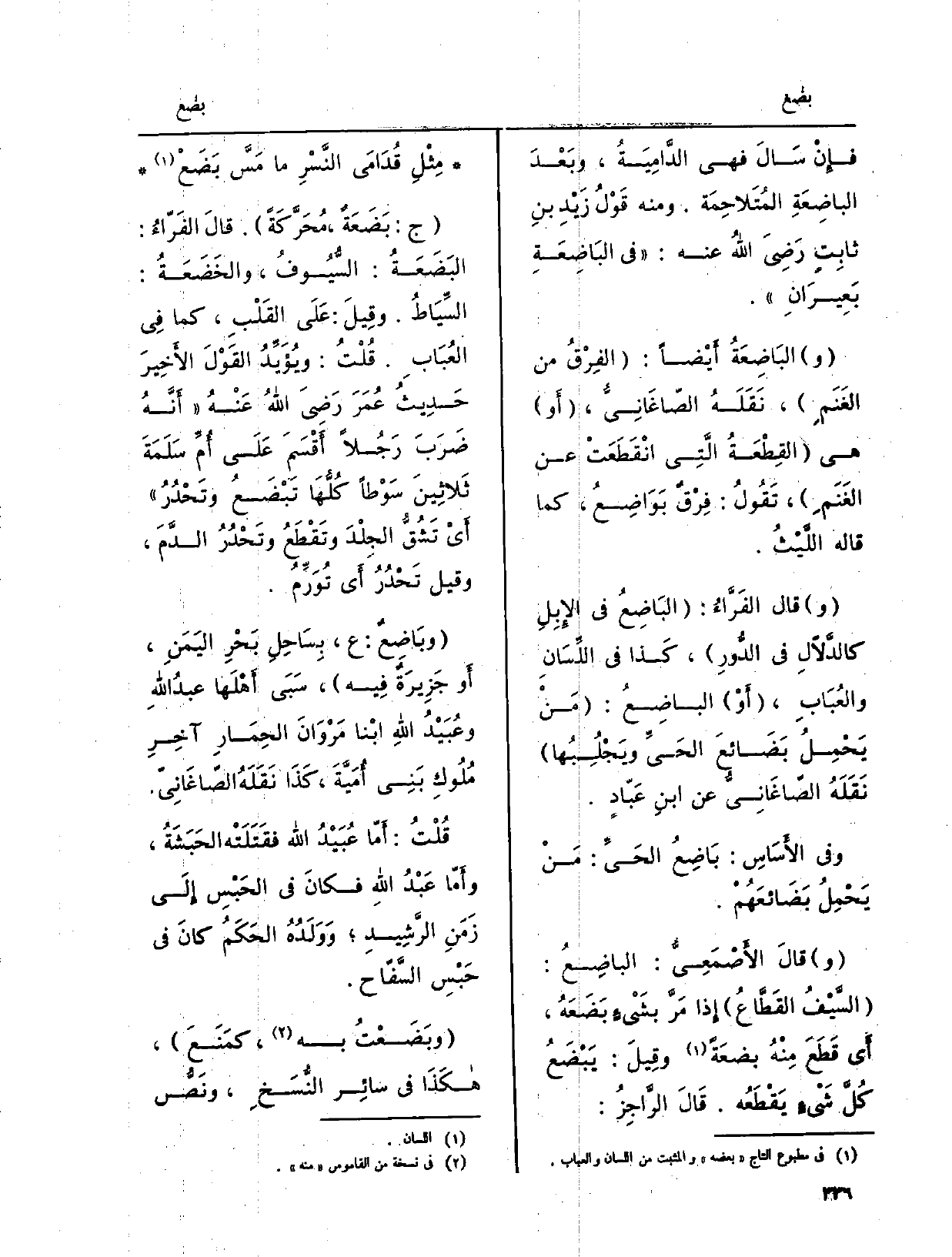 وَقَالَ الفَرَّاءُ: البَاضِعُ فِي الإِبِلِ كالدَّلالِ فِي الدُّورِ، كَذا فِي اللِّسَانِ والعُبَابِ، أَوْ الباضِعُ: مَنْ يَحْمِلُ بَضَائعَ الحَيِّ ويَجْلُبُها نَقَلَهُ الصّاغَانِيُّ عَن ابنِ عَبّادٍ. وَفِي الأَسَاسِ: بَاضِعُ الحَيِّ: مَنْ يَحْمِلُ بَضَائعَهُمْ. وقالَ الأَصْمَعِيُّ: الباضِعُ: السَّيْفُ القَطَّعُ إِذا مرَّ بشَيْءٍ بَضَعَهُ، أَي قَطَعَ مِنْهُ بَضعَةً وقِيلَ: يَبْضَعُ كُلَّ شَيْءٍ يَقْطَعَهُ. قالَ الرَّاجِزُ: مِثْلِ قُدَامَى النَّسْرِ مَا مَسَّ بَضَعْ ج: بَضْعَةٌ، مُحَرَّكَةً. قالَ الفَرّاءُ: البَضَعَةُ: السُّيُوفُ، والخَضَعَةُ: السَّيَاطُ. وقِيلَ: عَلَى القَلْبِ، كَمَا فِي العُبَابِ. قُلْتُ: ويُؤَيِّدُ القَوْلَ الأَخِيرَ حَدِيثَ عُمَرَ رَضِيَ اللهُ عَنْهُ أَنَّهُ ضَرَبَ رَجُلاً أَقْسَمَ عَلَى أُمِّ سَلَمَةَ ثَلاثِينَ سَوْطاً كُلُّهَا تَبْضَعُ أَي تشق الْجلد وتقطع وتحدر الدَّمَ، وَقيل تَحْدُرُ أَي تُوَرِّمُ.