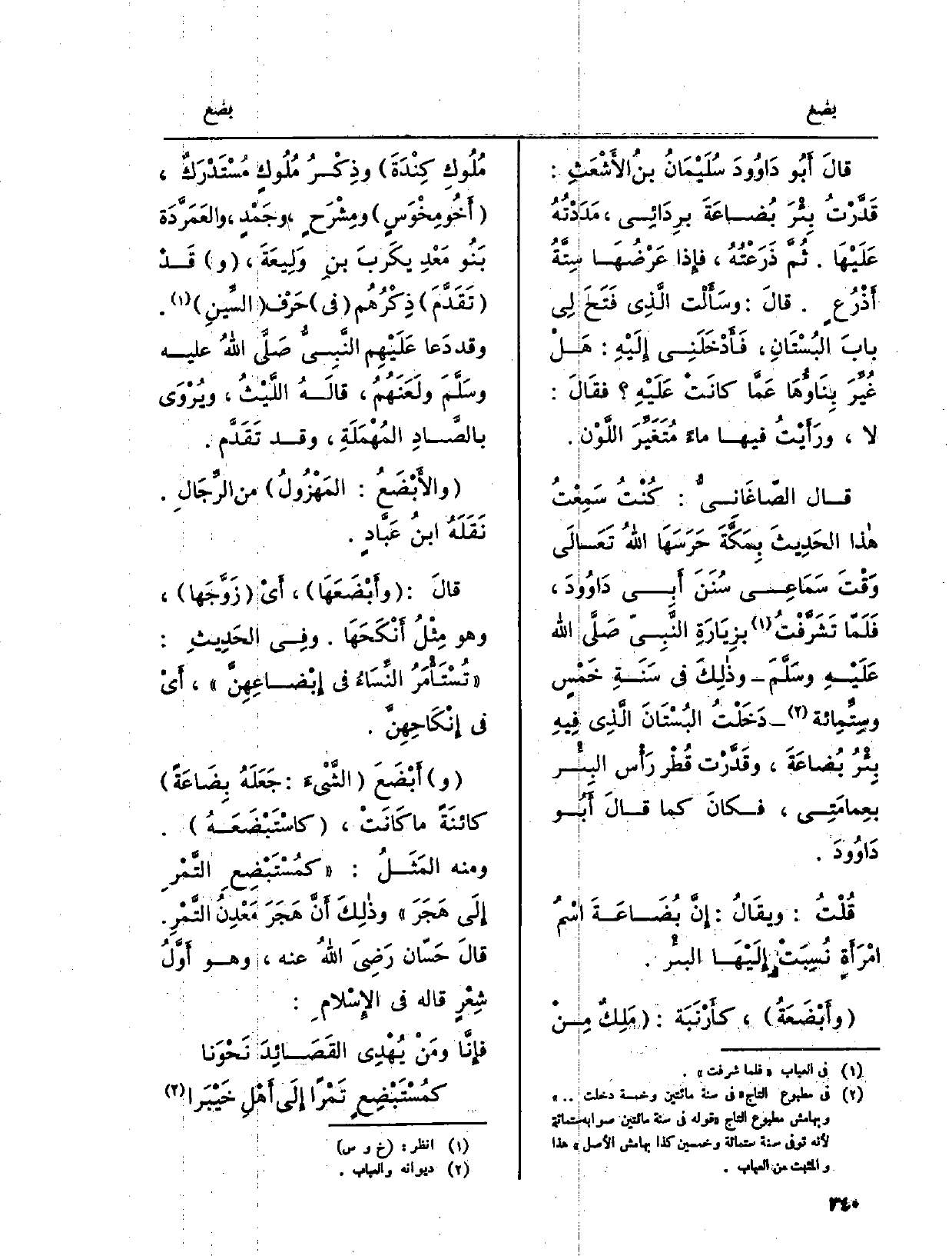 البُسْتَانَ الَّذِي فِيهِ بِئْرُ بُضاعَةَ، وقَدَّرْت قُطْر رَأْس البِئْر بعِمامَتِي، فكانَ كَمَا قالَ أَبُو دَاوُودَ. قُلْتُ: ويُقَالُ: إِنَّ بُضَاعَةَ اسْمُ امْرَأَةٍ نُسِبَتْ إِلَيْهَا البئِر.