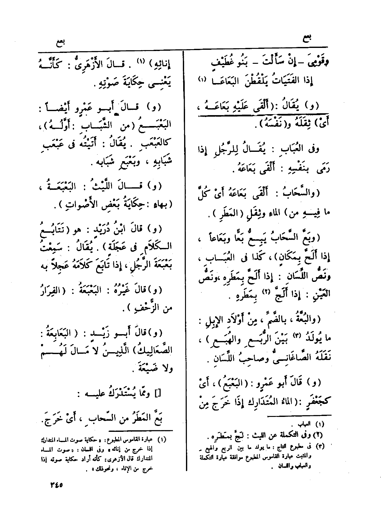 } وبَعَّ السَّحابُ {يَبِعُّ} بَعّاً {وبَعَاعاً، إِذا أَلَحَّ بِمَكَانٍ، كَذا فِي العُبَابِ، ونَصُّ اللِّسَانِ: إِذا أَلَحَّ بِمَطَرِهِ، ونَصُّ العَيْنِ: إِذا أَلَجَّ بِمَطَرهِ.} والبُعَّةُ، بالضَّمِّ، مِنْ أَوْلاَدِ الإِبِلِ: مَا يُولَدُ بَيْنَ الرُّبَعِ والهُبَعِ، نَقَلَهُ الصّاغَانِيُّ وصاحِبُ اللِّسَان. وقالَ أَبُو عَمْرٍ و: {البَعْبَعُ، أَيْ كجَعْفَرٍ: الماءُ المُتَدَارِك إِذَا خَرَجَ مِنْ إِنائِهِ. قالَ الأَزْهَرِيُّ: كأَنَّهُ يَعْنِي حِكَايَةَ صَوْتِهِ. وقالَ أَبُو عَمْرٍ وأَيْضاً:} البَعْبَعُ من الشَّبَابِ: أوَّلَهُ، كالعَبْعَبِ. يُقَالُ: أَتَيْتُه فِي عَبْعَبِ شَبَابِهِ، وبَعْبَعِ شَبَابه. وقالَ اللَّيْثُ: {البَعْبَعَةُ، بهاءٍ: حِكَايَةُ بَعْضِ الأَصْواتِ. وقالَ ابنُ دُرَيْدٍ: هُوَ تَتَابُعُ الكَلامِ فِي عَجَلَةٍ. يُقَالُ: سَمِعْتُ} بَعْبَعَةَ الرَّجُلِ، إِذا تَابَعَ كَلامَهُ عَجِلاً بِهِ. وقَالَ غَيْرُهُ: {البَعْبَعَةُ: الفِرَارُ من الزَّحْفِ.