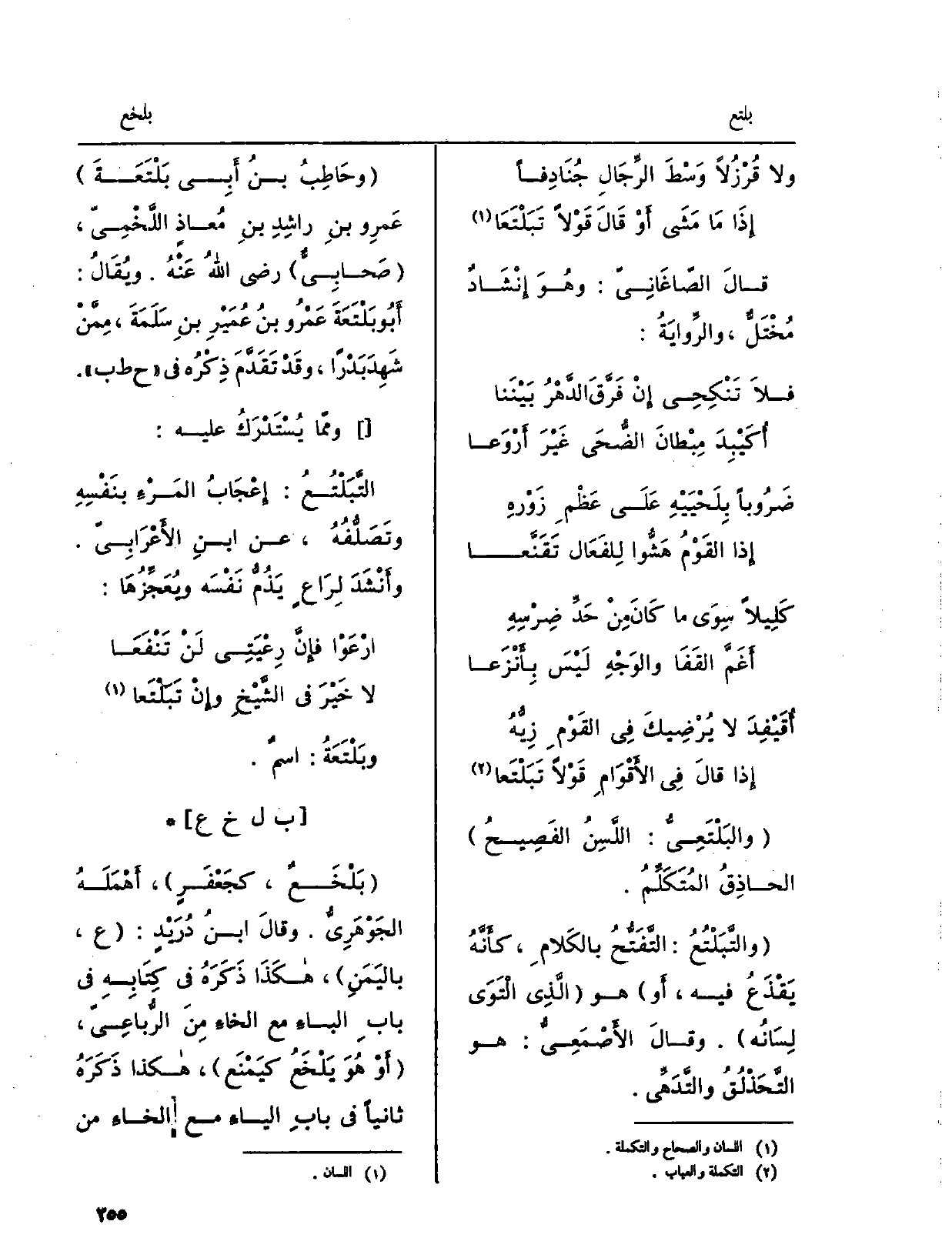 وممّا يُسْتَدْرَكُ عَلَيْهِ: التَّبَلْتُعُ: إِعْجَابُ المَرْءِ بنَفْسِهِ وتَصَلُّفُهُ، عَن ابنِ الأَعْرَابِيّ. وأَنْشَدَ لِرَاعٍ يَذُمُّ نَفْسَه ويُعَجِّزُهَا: ارْعَوْا فإِنَّ رِعْيَتِي لَنْ تَنْفَعَا لَا خَيْرَ فِي الشَّيْخِ وإِنْ تَبَلْتَعا وبلتعة: اسْم