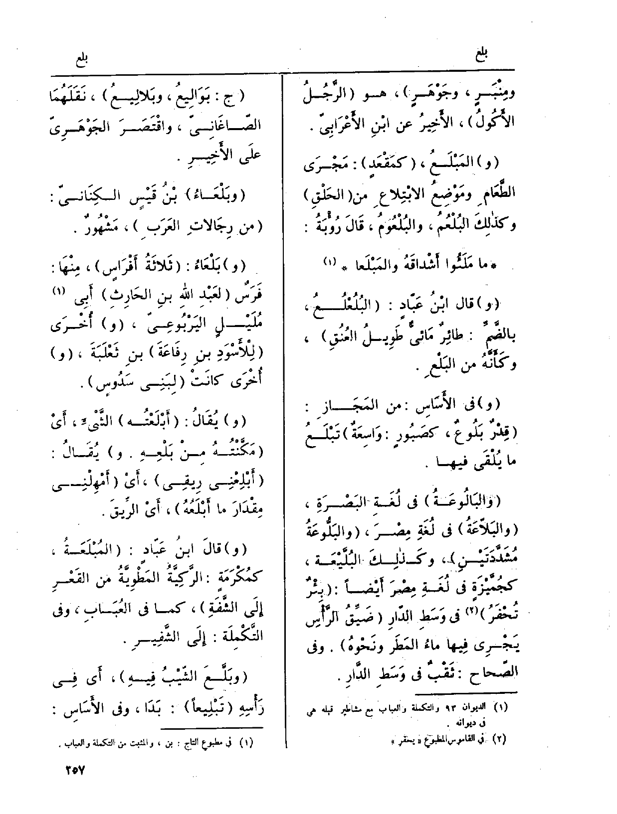 وبَلْعَاءُ: ثَلاثَةُ أَفْرَاسٍ، مِنْهَا: فَرَسٌ لعَبْدِ اللهِ بنِ الحَارِثِ أَبِي مُلَيْلٍ اليَرْبُوعِيّ، وأُخْرَى لِلأَسْوَدِ بنِ رِفَاعَةَ بنِ ثَعْلَبَة، وأُخْرَى كانَتْ لِبَنِي سَدُوسٍ. ويُقَالُ: أَبْلَعْتُه الشَّيْءِ، أَيْ مَكَّنْتُهُ مِنْ بَلْعِهِ. ويُقَالُ: أَبْلِعْنِي رِيقِي، أَيْ أَمْهِلْنِي مِقْدَارَ مَا أَبْلَعُهُ، أَيْ الرِّيقَ.)