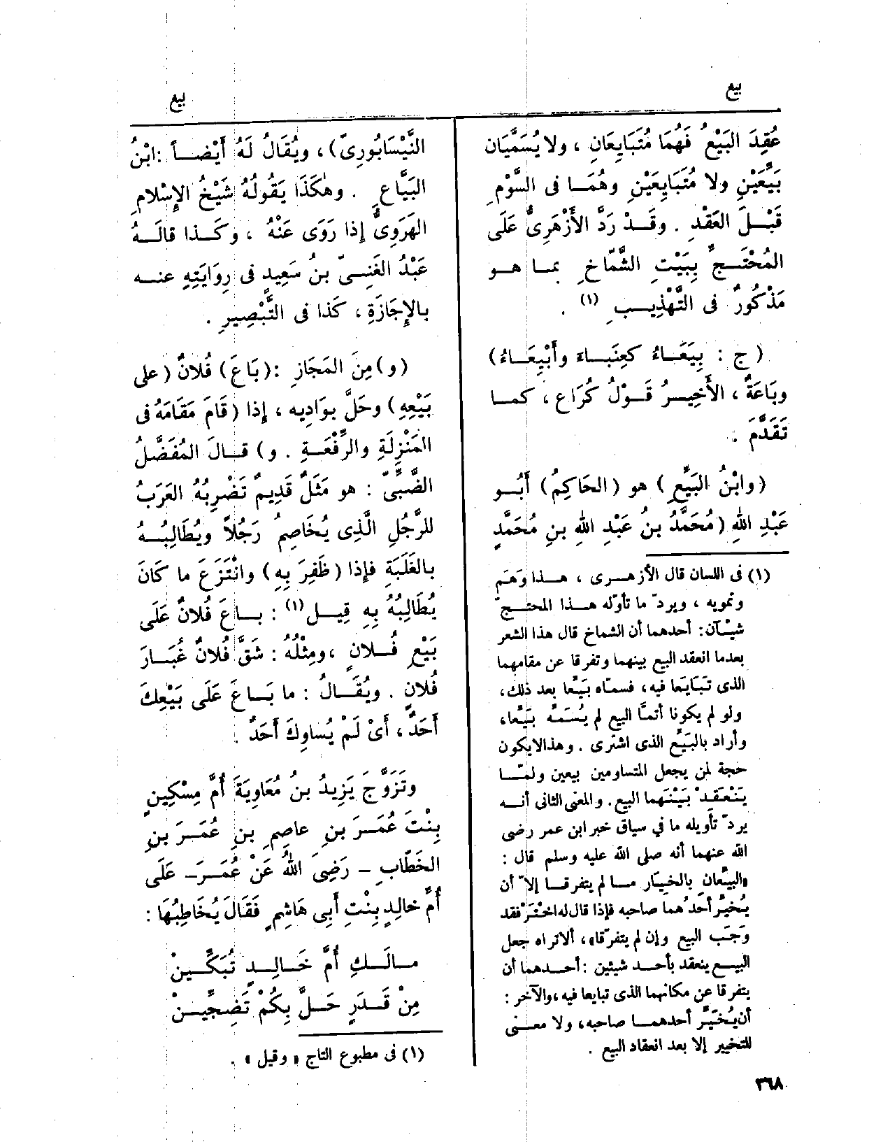 عُقِدَ البَيْعُ فَهُمَا {مُتَبَايِعَانِ، وَلَا يُسَمَّيَان} بَيِّعَيْنِ وَلَا {مُتَبَايِعَيْنِ وهُمَا فِي السَّوْمِ قَبْلَ العَقْدِ. وقَدْ رَدَّ الأَزْهَرِيُّ عَلَى المُحْتَجِّ بِبَيْتِ الشَّمّاخِ بِمَا هُوَ مَذْكُورٌ فِي التَّهْذِيبِ. ج:} بِيَعَاءُ كعِنَباءَ {وأَبِيْعَاءُ} وبَاعَةٌ، الأَخِيرُ قَوْلُ كُرَاع، كَمَا تَقَدَّمَ. وابْنُ {البَيِّعِ هُوَ الحَاكِمُ أَبُو عَبْدِ اللهِ مُحَمَّدُ بنُ عبْدِ اللهِ بنِ مُحَمَّدٍ النَّيْسَابُورِيّ، ويُقَالُ لَهُ) أَيْضاً: ابْنُ البَيَّاعِ، وهكَذَا يَقُولُهُ شَيْخُ الإِسْلامِ الهَرَوِيُّ إِذا رَوَى عَنْهُ، وكَذا قالَهُ عَبْدُ الغَنِيّ بنُ سَعِيدٍ فِي رِوَايَتِهِ عَنهُ بالإجَازَةِ، كَذا فِي التَّبْصِيرِ. ومِنَ المَجَازِ: بَاعَ فُلانٌ على} بَيْعِهِ وحَلَّ بوَادِيه، إِذا قَامَ مَقَامَهُ فِي المَنْزِلَةِ والرِّفْعَةِ. وقالَ المُفَضَّلُ الضَّبِّيّ: هُوَ مَثَلٌ قَدِيمٌ تَضْرِبُهُ العَرَبُ للرَّجُلِ الَّذِي يُخَاصِمُ رَجُلاً ويُطَالِبُهُ بالغَلَبَةِ فإِذا ظَفِرَ بِهِ وانْتَزَعَ مَا كَانَ يُطَالِبُهُ بِهِ قِيل: {باعَ فُلانٌ عَلَى بَيْعِ فُلانٍ، ومِثْلُهُ: شَقَّ فُلانٌ غُبَارَ فُلانٍ. ويُقَالُ: مَا بَاعَ عَلَى} بَيْعِكَ أَحَدٌ، أَيْ لَمْ يُساوِكَ أَحَدٌ.