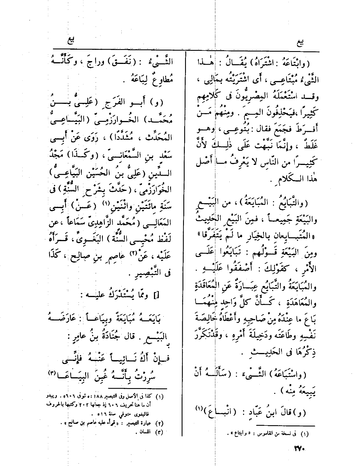 {واسْتَبَاعَهُ الشَّيْءَ: سَأَلَهُ أَنْ} يَبِيعَهُ مِنْه. وقالَ ابنُ عَبّادٍ: {انْباعَ الشَّيْءُ: نَفَقَ وراجَ، وكَأَنَّهُ مُطاوِعٌ} لِبَاعَهُ. وأَبو الفَرَجِ عَلِيُّ بنُ مُحَمَّد الخُوارَزْمِيّ {- البَيَّاعِيُّ المُحَدِّث، مُشَدَّداً، رَوَى عَنْ أَبِي سَعْدٍ بنِ السَّمْعَانِيّ، وكَذَا مَجْدُ الدَّينِ عَلِيُّ بنُ الحُسَيْن البَيَّاعِيُّ الخُوَارَزْميّ، حَدَّثَ بِشَرْحِ السُّنَّةِ فِي سَنَةِ مائَتَيْنِ واثْنَيْنِ عَنْ أَبِي المَعَالِي مُحَمَّدٍ الزَّاهِدِيّ سَمَاعاً، عَن لَفْظ مُحْيِي السُّنَّة البَغَوِيِّ، قَرَأَهُ عَلَيْه، عَنْ عاصِمِ بنِ صالِح، كَذَا فِي التَبْصِيرِ. وممّا يُسْتَدْرَكُ عَلَيْهِ:} بَايَعَهُ {مُبَايَعَةً} وبِيَاعاً: عَارَضَهُ بالبَيْعِ. قَالَ جُنَادَةُ بنُ عامِرٍ: