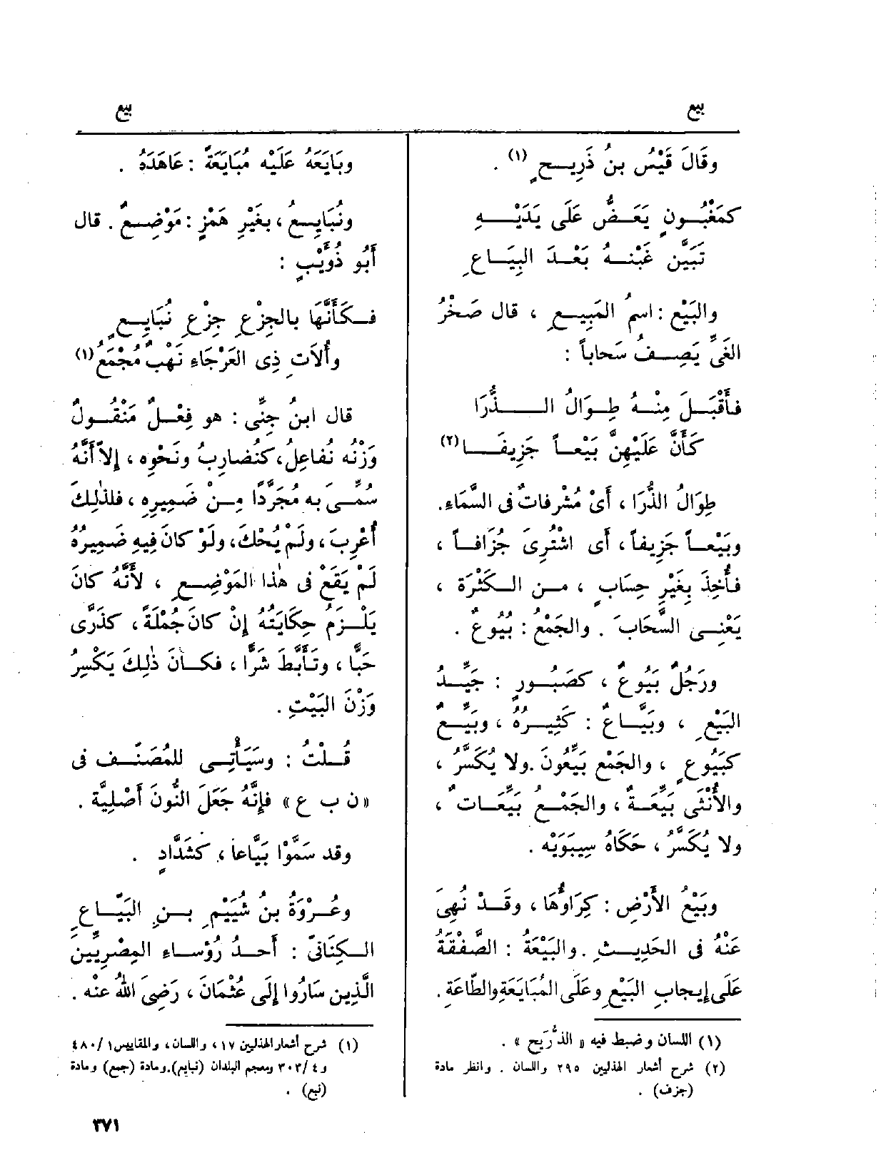 {وبَيْعُ الأَرْضِ: كِرَاؤُهَا، وقَدْ نُهِيَ عَنْهُ فِي الحَدِيثِ.} والبَيْعَةُ: الصَّفْقَةُ عَلَى إِيجابِ البَيْعِ وعَلَى {المُبَايَعَةِ والطّاعَةِ. وبَايَعَهُ عَلَيْه مُبَايَعَةً: عَاهَدَهُ. ونُبَايِعُ، بغَيْرِ هَمْزٍ: مَوْضِعٌ. قَالَ أَبُو ذُؤَيْبٍ: