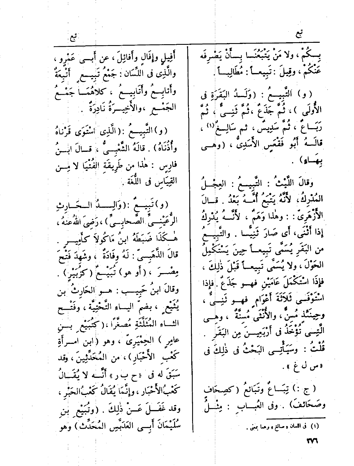 وقالَ اللَّيْثُ: التَّبِيعُ: العِجْلُ المُدْرِكُ لأَنَّهُ يَتْبَعُ أُمَّهُ بَعْدُ. قالَ الأَزْهَرِيّ: وَهَذَا وَهَمٌ، لأَنَّهُ يُدْرِكُ إِذا أَثْنَى، أَي صَارَ ثَنِيّاً. والتَّبِيعُ من البَقَرِ يُسَمَّى تَبِيعاً حِينَ يَسْتَكْمِلُ الحَوْلَ، وَلَا يُسَمَّى تِبِيعاً قَبْلَ ذلِكَ، فإِذَا اسْتَكْمَلَ عَامَيْنِ فَهُوَ جَذَعٌ. فإِذا اسْتَوْفَى ثَلاَثَةَ أَعْوَامٍ فَهُوَ ثَنِيٌّ، وحِينَئِذٍ مُسِنٌّ، والأُنْثَى مُسِنَّةٌ، وَهِي الَّتِي تَؤْخَذُ فِي أَرْبَعِينَ مِن البَقَرِ. قُلْتُ: وسَيَأْتِي البَحْثُ فِي ذلِكَ فِي س ل غ. ج: تِبَاعٌ وتَبَائعُ كصِحَافٍ وصَحَائفَ. وَفِي العُبَابِ: مِثْلُ أَفِيلٍ وإِفَالٍ وأَفائِلَ، عَن أَبي عَمْروٍ، والَّذِي فِي اللِّسَان: جَمْعُ تِبِيعٍ أَتْبِعَةٌ وأَتابِعُ وأَتَابِيعُ، كلاهُمَا جَمْعُ الجَمْعِ، والأَخِيرَةُ نَادِرَةٌ.)