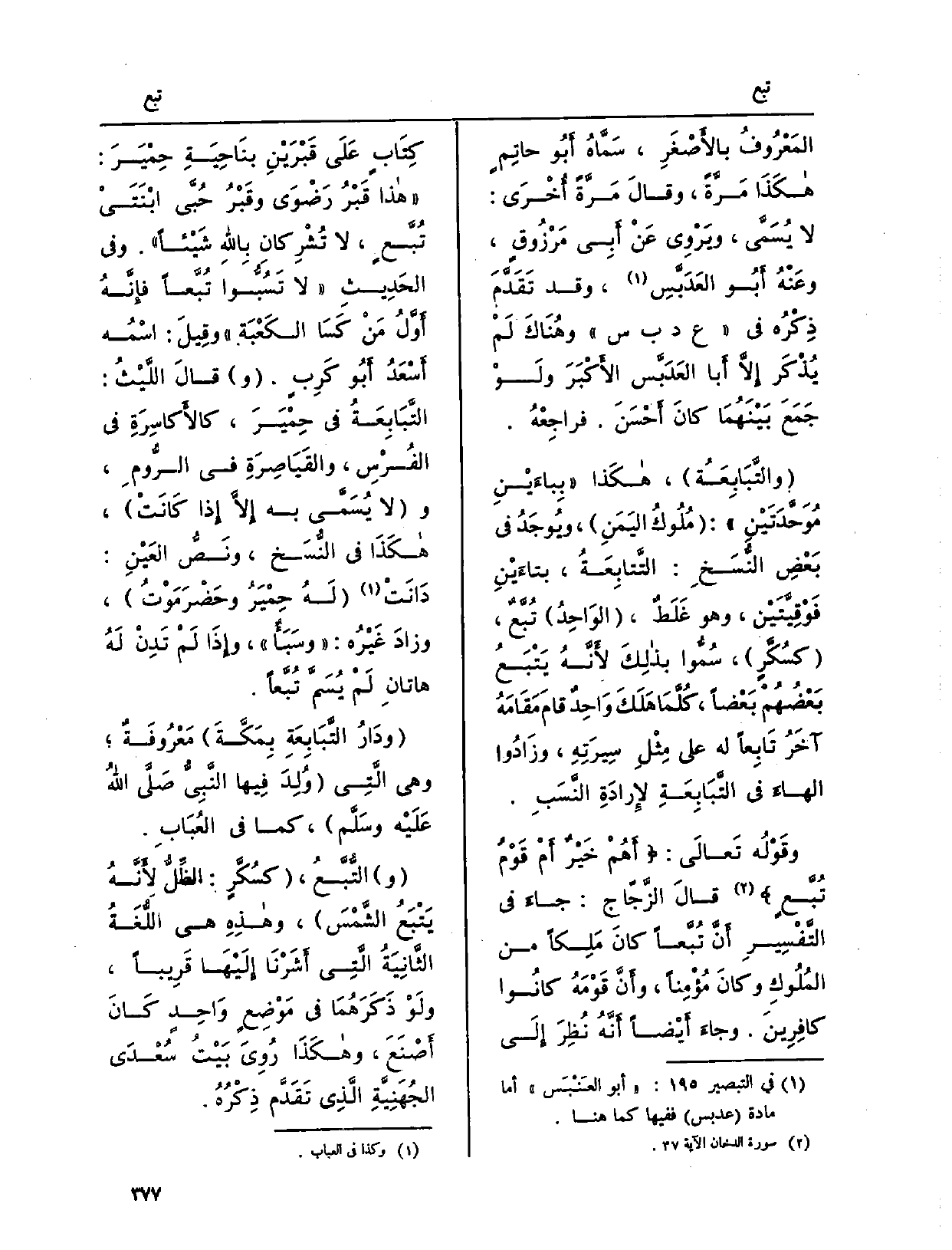 وقَوْلُه تَعالَى: أَهُمْ خَيْرٌ أَمْ قَوْمٌ تُبَّعٍ قالَ الزَّجّاج: جاءَ فِي التَّفْسِيرِ أَنَّ تُبَّعاً كانَ مَلِكاً من المُلُوكِ وكانَ مُؤْمِناً، وأَنَّ قَوْمَهُ كانُوا كافِرِينَ، وجاءَ أَيْضاً أَنَّهُ نُظِرَ إِلَى كِتَابٍ عَلَى قَبْرَيْنِ بنَاحِيَةِ حَمْيَرَ: هَذَا قَبْرُ رَضْوَى وقَبْرُ حُبَّى ابْنَتَيْ تُبَّعٍ، لَا تُشْرِكان بِاللهِ شَيْئاً. وَفِي الحَدِيثِ لَا تَسُبُّوا تُبَّعاً فإِنَّهُ أَوَّلُ مَنْ كَسَا الكَعْبَة وقِيلَ: اسْمُه أَسْعَدُ أَبُو كَرِبٍ. وقالَ اللَّيْثُ: التَّبَابِعَةُ فِي حِمْيَرَ، كالأَكاسِرَةِ فِي الفُرْسِ، والقَيَاصِرَةِ فِي الرُّومِ، وَلَا يُسَمَّى بِهِ إِلاَّ إِذا كَانَتْ، هكَذَا فِي النُّسَخ، ونَصُّ العَيْنِ: دَانَتْ لَهُ حِمْيَرُ وحَضْرَمَوْتُ، وزادَ غَيْرُه: وسَبَأٌ، وإِذا لَمْ تَدِنْ لَهُ هاتانِ لَمْ يُسَمَّ تُبَّعاً.