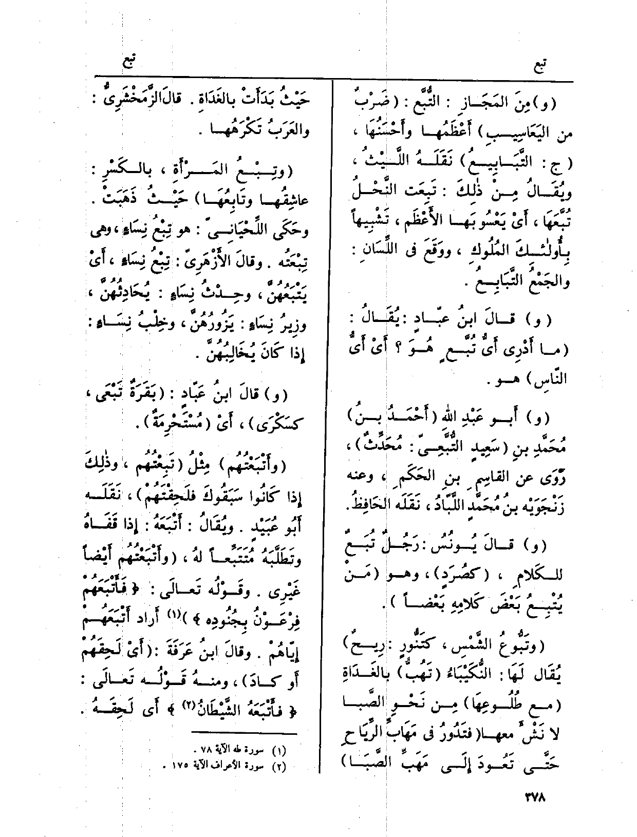 وقَوْلُه تَعالَى: فَأَتْبَعَهُمْ فِرْعُوْنُ بِجُنُودِه أَراد أَتْبَعَهُمْ إِيّاهُمْ. وقالَ ابنُ عَرَفَةَ: أَيْ لَحِقُهُمْ أَو كادَ، ومنهُ قَوْلُه تعالَى: فأَتْبَعَهُ الشَّيْطَانُ أَي لَحِقَهُ.