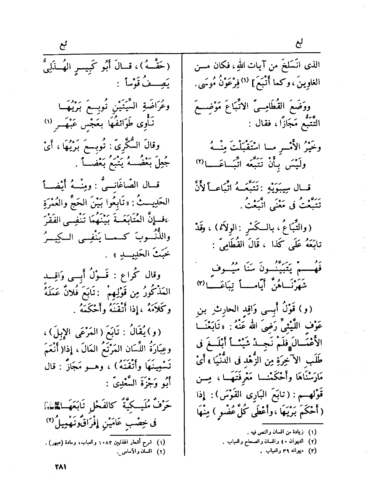 انَسَلخَ من آيَات اللهِ، فَكَانَ من الغاوِينَ، وكما أَتْبَعَ فِرْعُوْنُ مُوسَى. ووَضَعَ القُطَامِيّ الإتباع مَوْضِعَ التَّتَبُّع مَجَازاً، فَقَالَ: