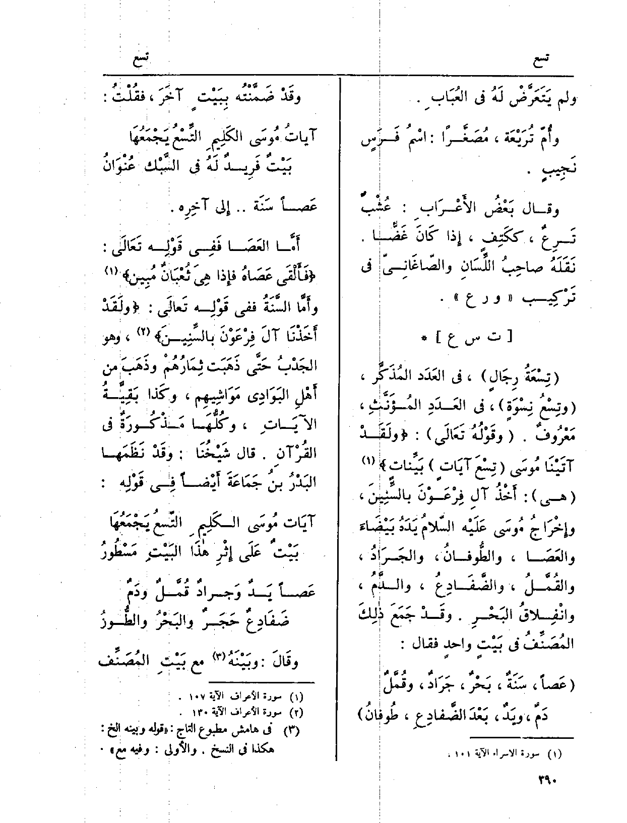 تِسْعَةُ رِجَالٍ، فِي العَدَد المُذَكَّر، وتِسْعُ نِسْوَةٍ، فِي العَدَدِ المُؤَنَّثِ، مَعْرُوفٌ. وقَوْلُهُ تَعَالَى: ولَقَدْ آتَيْنَا مُوَسَى تِسْعَ آيَاتٍ بَيَّناتٍ هِيَ: أَخْذُ آلِ فِرْعَوْنَ بالسِّنِينَ، وإِخْرَاجُ مُوسَى عَلَيْه السّلامُ يَدَهُ بَيْضَاءَ والعَصَا، والطُّوفانُ، والجَرَادُ، والقُمَّلُ، والضَّفَادِعُ، والدَّمُ، وانْفِلاقُ البَحْرِ. وقَدْ جَمَعَ ذلِكَ المُصَنِّفُ فِي بَيْتٍ واحدٍ فَقَالَ: