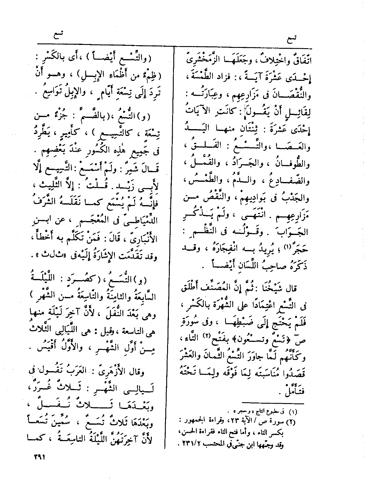 وَقَالَ الأَزْهَرِيّ: العَرَبُ تَقُول فِي لَيالِي الشَّهْرِ: ثَلاثٌ غُرَرٌ، وبَعْدَهَا ثَلاثٌ نُفَلٌ، وبَعْدَهَا ثَلاثٌ تَسَعٌ، سُمِّينَ تُسَعاً لأَنَّ آخِرَتَهُنَّ اللَّيْلَةُ التاسِعَةُ، كَمَا