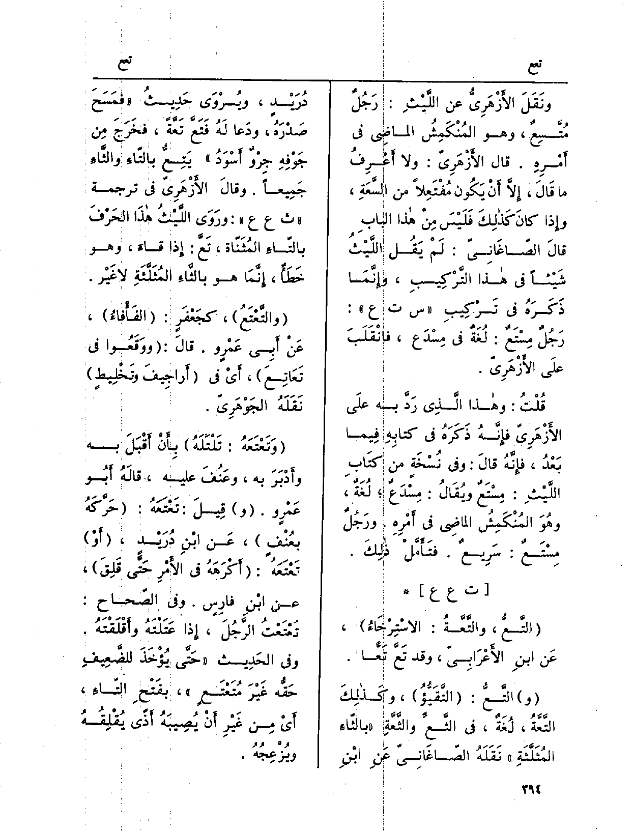 ونَقَلَ الأَزْهَرِيُّ عَن اللَّيْثِ: رَجُلٌ مُتَّسِعٌ، وَهُوَ المُنْكَمِشُ الماضِي فِي أَمْرِهِ. قَالَ الأَزْهَرِيّ: وَلَا أَعْرفُ مَا قَالَ، إِلاَّ أَنْ يَكُون مُفْتَعِلاً من السَّعَةِ، وإِذا كانَ كَذلِكَ فَلَيْسَ مِنْ هَذَا البابِ قالَ الصّاغَانِيّ: لَمْ يَقُل اللَّيْثُ شَيْئاً فِي هَذَا التَّرْكِيبِ، وإِنَّمَا ذَكَرَهُ فِي تَرْكِيبِ س ت ع: رَجُلٌ مِسْتَعٌ: لُغَةٌ فِي مِسْدَع، فانْقَلَبَ علَى الأَزْهَرِيّ. قُلْتُ: وَهَذَا الَّذِي رَدَّ بِهِ علَى الأَزهَرِيّ فإِنَّهُ ذَكَرَهُ فِي كتابِهِ فِيما بَعْدُ، فإِنَّهُ قالَ: وَفِي نُسْخَةٍ من كتَابِ اللَّيْثُ: مِسْتَعٌ ويُقَالُ: مِسْدَعٌ، لُغَةٌ، وهُوَ المُنْكَمِشُ الماضِي فِي أَمْرِهِ. ورَجُلٌ مِسْتَعٌ: سَرِيعٌ.