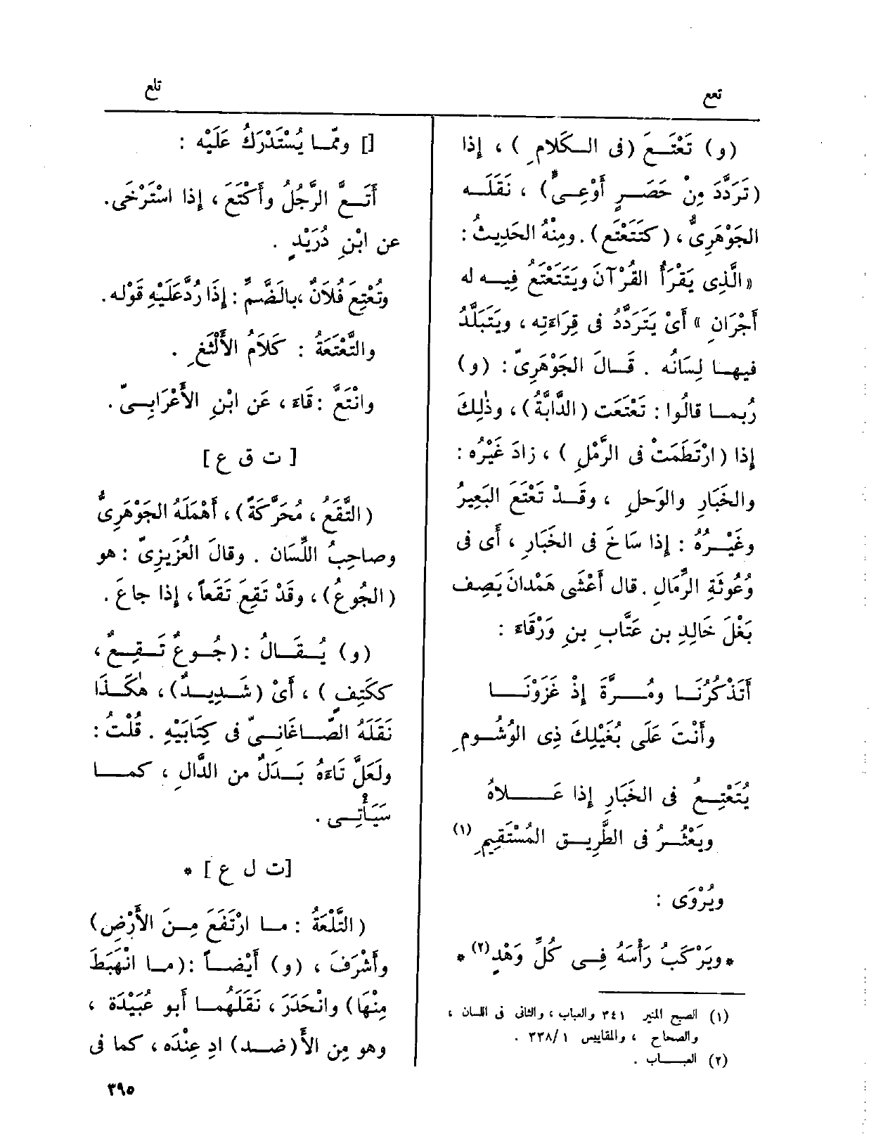 ويُرْوَى: ويَرْكَبُ رَأْسَهُ فِي كُلِّ وَهْدٍ وممّا يُسْتَدْرَكُ عَلَيْه: {أَتَعَّ الرَّجُلُ وأَكْتَعَ، إِذا اسْتَرْخَى. عَن ابْنِ دُرَيْدٍ.} وتُعْتِعَ فُلاَنٌ، بالضَّمِّ: إِذَا رُدَّ عَلَيْهِ قَوْله. {والتَّعْتَعَةُ: كَلاَمُ الأَلْثَغِ.} وانْتَعَّ: قَاءَ، عَن ابْنِ الأَعْرَابِيّ.