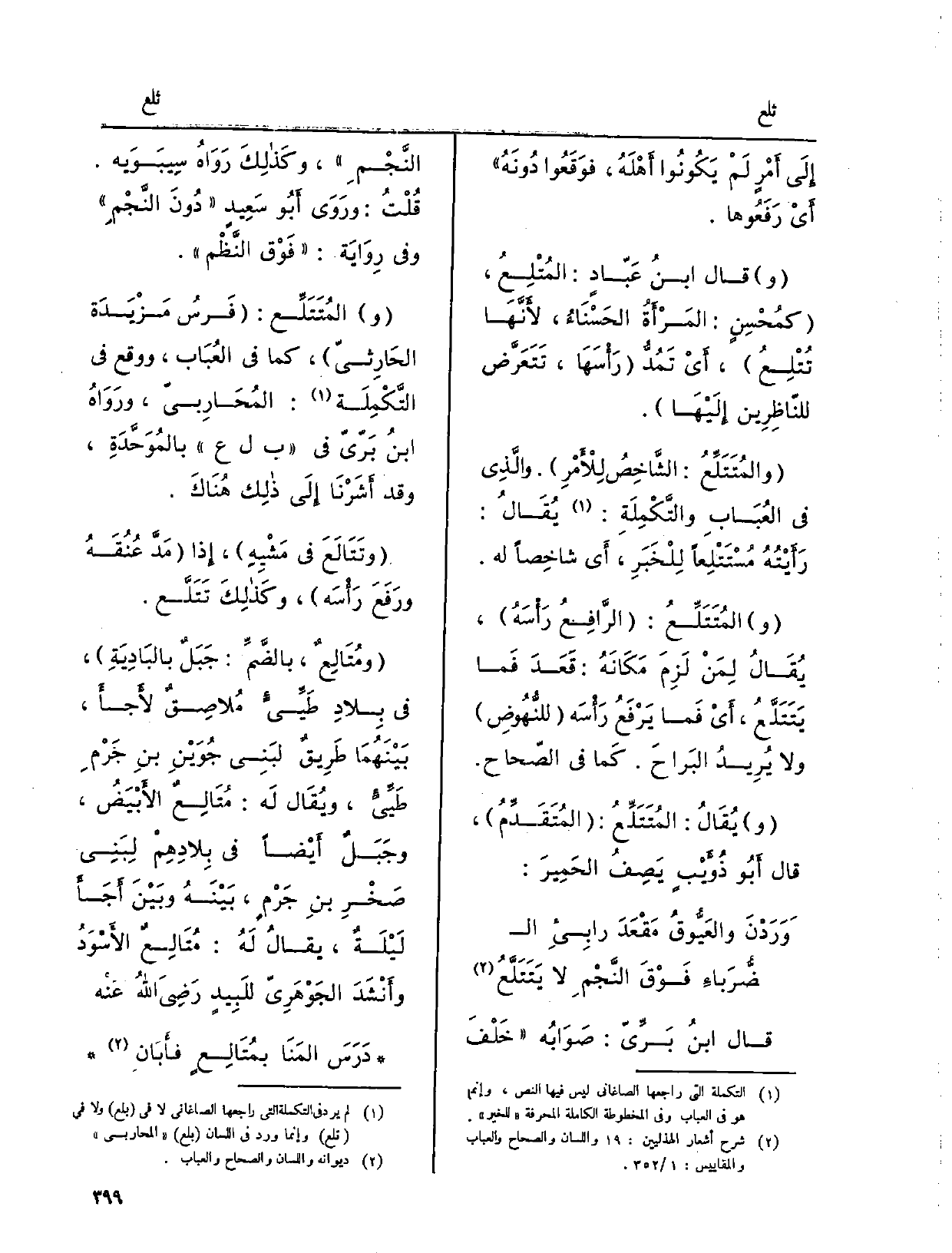 وَقَالَ ابنُ عَبّادٍ: المُتْلِعُ، كمُحْسِنٍ: المَرْأَةُ الحَسْناءُ، لأَنَّهَا تُتْلِعُ، أَيْ تَمُدُّ رَأْسَهَا، تَتَعَرَّض للنّاظِرِين إِلَيْهَا. والمُتَتَلِّعُ: الشَّاخِصُ لِلأَمْرِ. والَّذِي فِي العُبَابِ والتَّكْمِلَةِ: يُقَالُ: رَأَيْتُهُ مُسْتَتْلِعاً لِلْخَبَرِ، أَي شاخَصاً لَهُ. والمُتَتَلِّعُ: الرَّافِعُ رَأْسَهُ، يُقَالُ لِمَنْ لَزِمَ مَكَانَهُ: قَعَدَ فَما يَتَتَلَّعُ، أَيْ فَما يَرْفَعُ رَأْسَه للنُّهُوضِ وَلَا يُرِيدُ البَراحَ. كَما فِي الصّحاح.