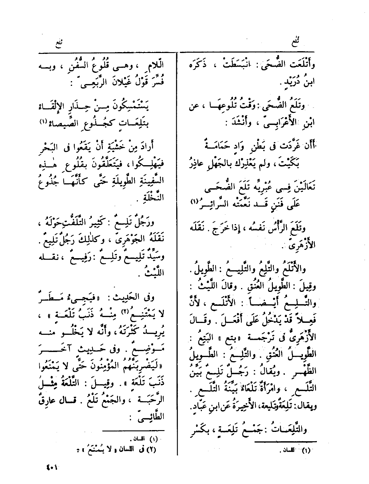 والتَّلِعَاتُ: جَمْعُ تَلِعَةٍ، بكَسْرِ الّلامِ، وَهِي قُلُوعُ السُّفُنِ، وَبِه فُسِّرَ قَوْلُ غَيْلانَ الرَّبَعِيّ: يَسْتَمْسِكُونَ مِنْ حِذَارِ الإِلْقَاءْ بتَلِعَاتٍ كجُذُوعِ الصَّيصاءْ أَرادَ مِنْ خَشْيَةِ أَنْ يَقَعُوا فِي البَحْرِ فيَهْلِكُوا، فيَتعَلَّقُونَ بقُلُوعِ هذِه السَّفِينَةِ الطَّوِيلَةِ حَتَّى كأَنَّهَا جُذُوعُ النَّخْلَةِ. ورَجُلٌ تَلِعٌ: كَثِيرُ التَّلَفُّتِ حَوْلَهُ، نَقَلَهُ الجَوْهَرِيّ، وكذلِكَ رَجُلٌ تَلِيعٌ. وسَيِّدٌ تَلِيعٌ وتَلِعٌ: رَفِيعٌ، نَقله اللَّيْثُ. وَفِي الحَدِيث: فيَجِيءُ مَطَرٌ لَا يَمْتَنِعُ مِنْهُ ذَنَبُ تَلْعَةٍ، يُرِيدُ كَثْرَتَهُ، وأَنَّه لَا يَخْلُو مِنْهُ مَوْضِعٌ. وَفِي حَدِيثٍ آخَرَ لَيَضْرِبَنَّهُمُ المُؤْمِنُونَ حَتَّى لَا يَمْنَعُوا ذَنَبَ تَلْعَةٍ. وقِيلَ: التَّلْعَةُ مِثْلُ الرَّحَبَة، والجَمْعُ تَلْعُ. قَالَ عارِقٌ الطّائِيّ: