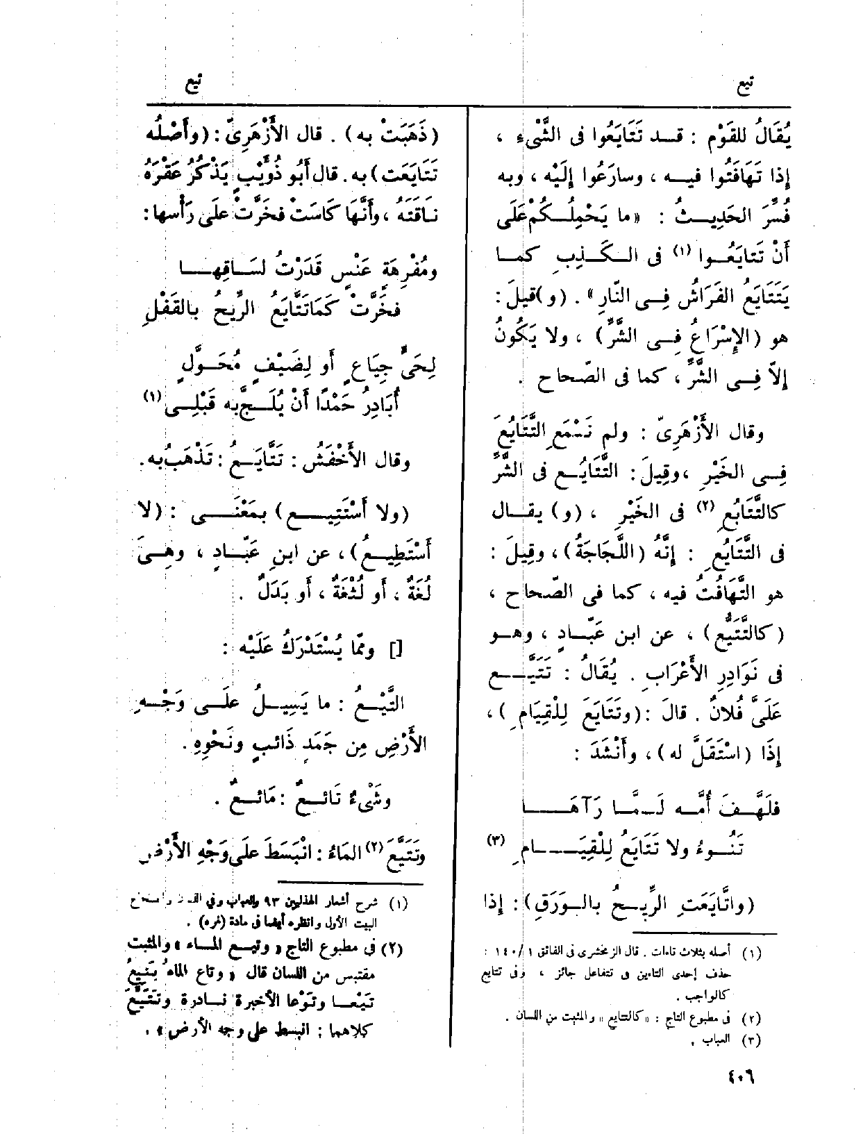 {واتَّايَعَتِ الرِّيحُ بالوَرَقِ: إِذا ذَهَبَتْ بِهِ. قَالَ الأَزْهَرِيّ: وأَصْلُه} تَتَايَعَت بِهِ. قَالَ أَبُو ذُؤَيْبٍ يَذْكُرُ عَقْرَهُ نَاقَتَهُ، وأَنَّهَا كَاسَتْ فخَرَّتْ علَى رَأْسها: