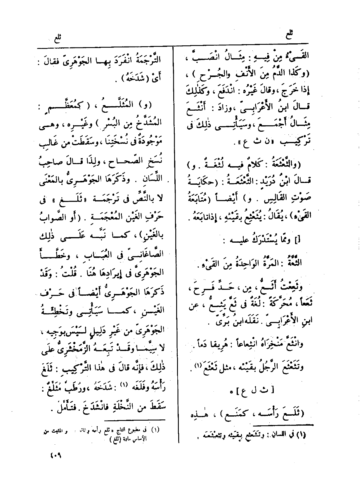 ثَلَعَ رَأْسَه، كمَنَع، هذهِ التَّرْجَمَةُ انْفَرَدَ بِها الجَوْهَرِيّ فقالَ: أَيْ شَدَخَهُ.