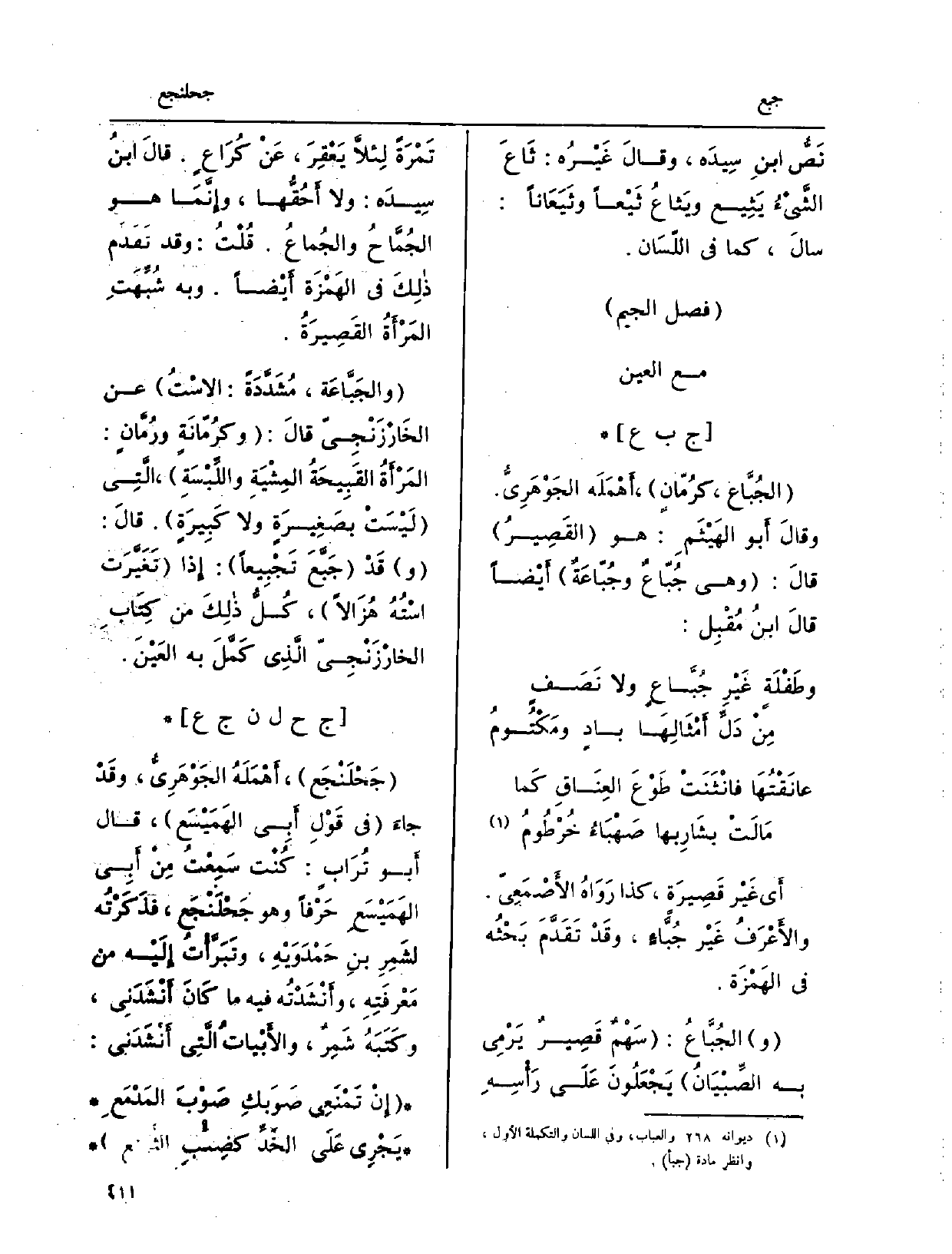 والجُبَّاعُ: سَهْمٌ قَصِيرٌ يَرْمِى بِهِ الصِّبْيَانُ يَجْعَلُونَ عَلَى رَأْسِهِ تَمْرَةً لِئلاَّ يَعْقِرَ، كُرَاع. قالَ ابنُ سِيدَه: وَلَا أَحُقُّها، وإِنَّمَا هُوَ الجُمَّاحُ والجُماعُ. قُلْتُ: وَقد تَقَدَّم ذلِكَ فِي الهَمْزَة أَيْضاً. وَبِه شُبِّهَتِ المَرْأَةُ القَصِيرَةُ. والجَبَّاعَة، مُشَدَّدَةً: الاسْتُ عَن الخَارْزَنِجِيّ قالَ: وكرُمّانَةٍ ورُمَّانٍ: المَرْأَةُ القَبِيحَةُ المِشْيَةِ واللِّبْسَةِ، الَّتِي لَيْسَتْ بصَغِيرَةٍ وَلَا كَبِيرَةٍ. قالَ: وقَدْ جَبَّعَ تَجْبِيعاً: إِذا تَغَيَّرَت اسْتُهُ هُزَالاً، كُلُّ ذلِكَ من كِتَابِ الخَارْزَنْجِيّ الَّذِي كَمَّلَ بِهِ العَيْنَ.