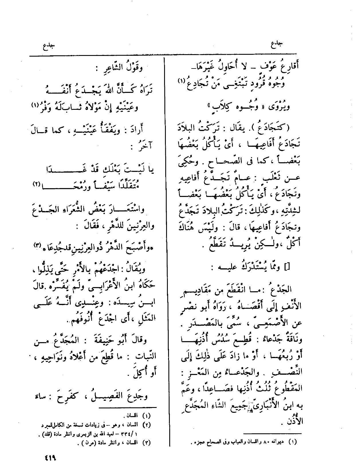 واسْتَعَارَ بَعْضُ الشُّعَرَاءِ الجَدْعَ والعِرْنِينَ للدَّهْرِ، فَقَالَ: وأَصْبَحَ الدَّهْرُ ذُو العِرْنِينِ قد جُدِعَا ويُقَالُ: اجْدَعْهُمْ بالأَمْرِ حَتَّى يَذِلُّوا، حَكَاهُ ابنُ الأَعْرَابِيّ ولَمْ يُفَسِّرْه. قالَ ابنُ سِيدَه: وعِنْدِي أَنَّهُ عَلَى المَثَلِ، أَي اجْدَعْ أُنُوفَهُم. وقالَ أَبُو حَنِيفَةَ: المُجَدَّعُ من النّباتِ: مَا قُطِعَ من أَعلاهُ ونَوَاحِيهِ، أَو أُكِلَ. وجَدِعَ الفَصِيلُ، كفَرِحَ: ساءَ