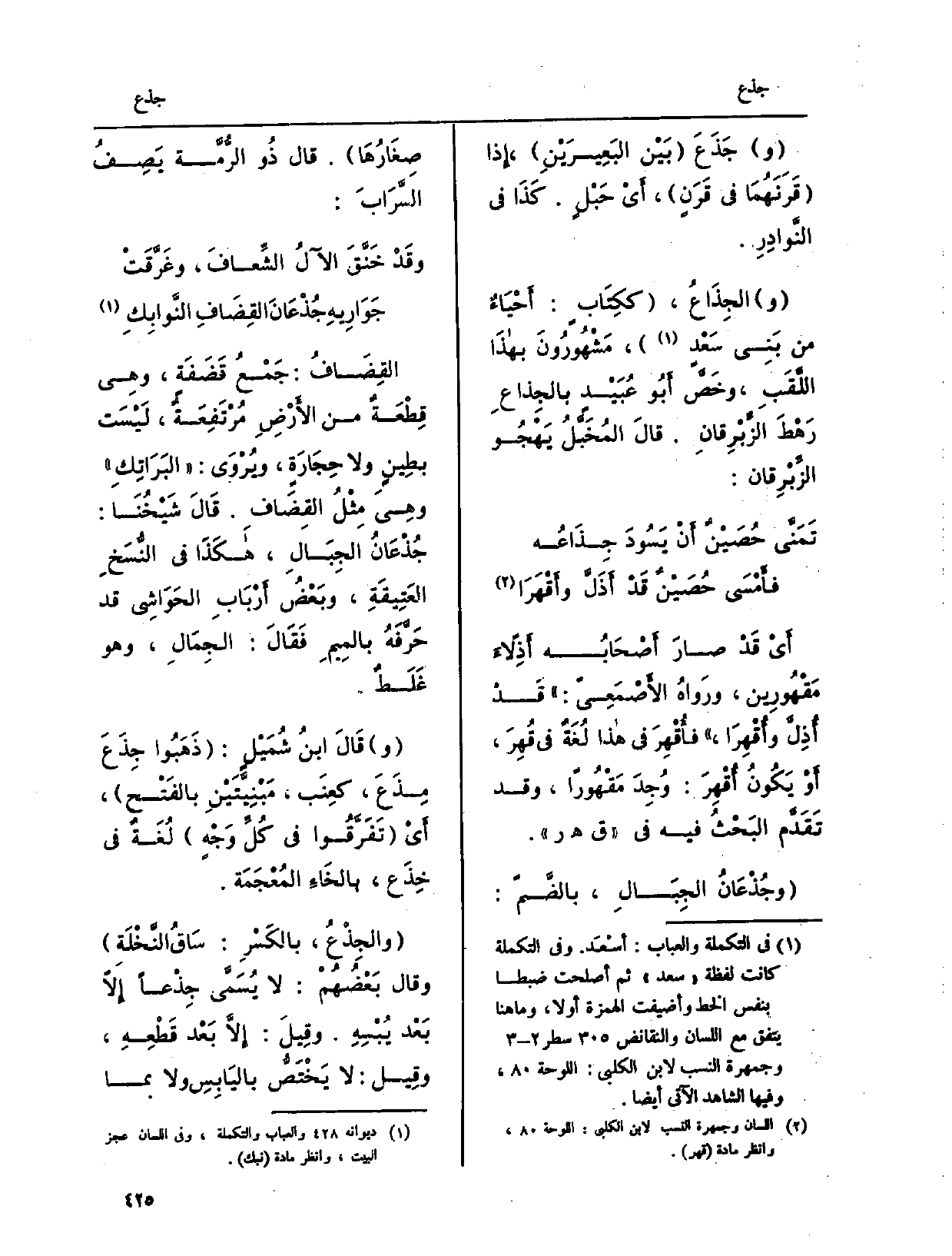 القِضَافُ: جَمْعُ قَضَفَةٍ، وَهِي قِطْعَةٌ من الأَرْضِ مُرْتَفِعَةٌ، لَيْسَت بطِينٍ وَلَا حِجَارَةٍ، ويُرْوَى: البَرَاتِكِ وهِيَ مِثْلُ القِضَافِ. قَالَ شَيْخُنَا: جُذْعَانُ الجِبَالِ، هكَذَا فِي النُّسَحِ العَتِيقَةِ، وبَعْضُ أَرْبَابِ الحَوَاشي قد حَرَّفَهُ بالمِيمِ فَقَالَ: الجِمَالِ، وَهُوَ غَلَطٌ. وقَالَ ابنُ شُمَيْلٍ: ذَهَبُوا جَذَعَ مِذَعَ، كعِنَب، مَبْنِيَّتَيْنِ بالفَتْح، أَيْ تَفَرَّقُوا فِي كُلِّ وَجْهٍ لُغَةٌ فِي خِذَع، بالخَاءِ المُعْجَمَة.