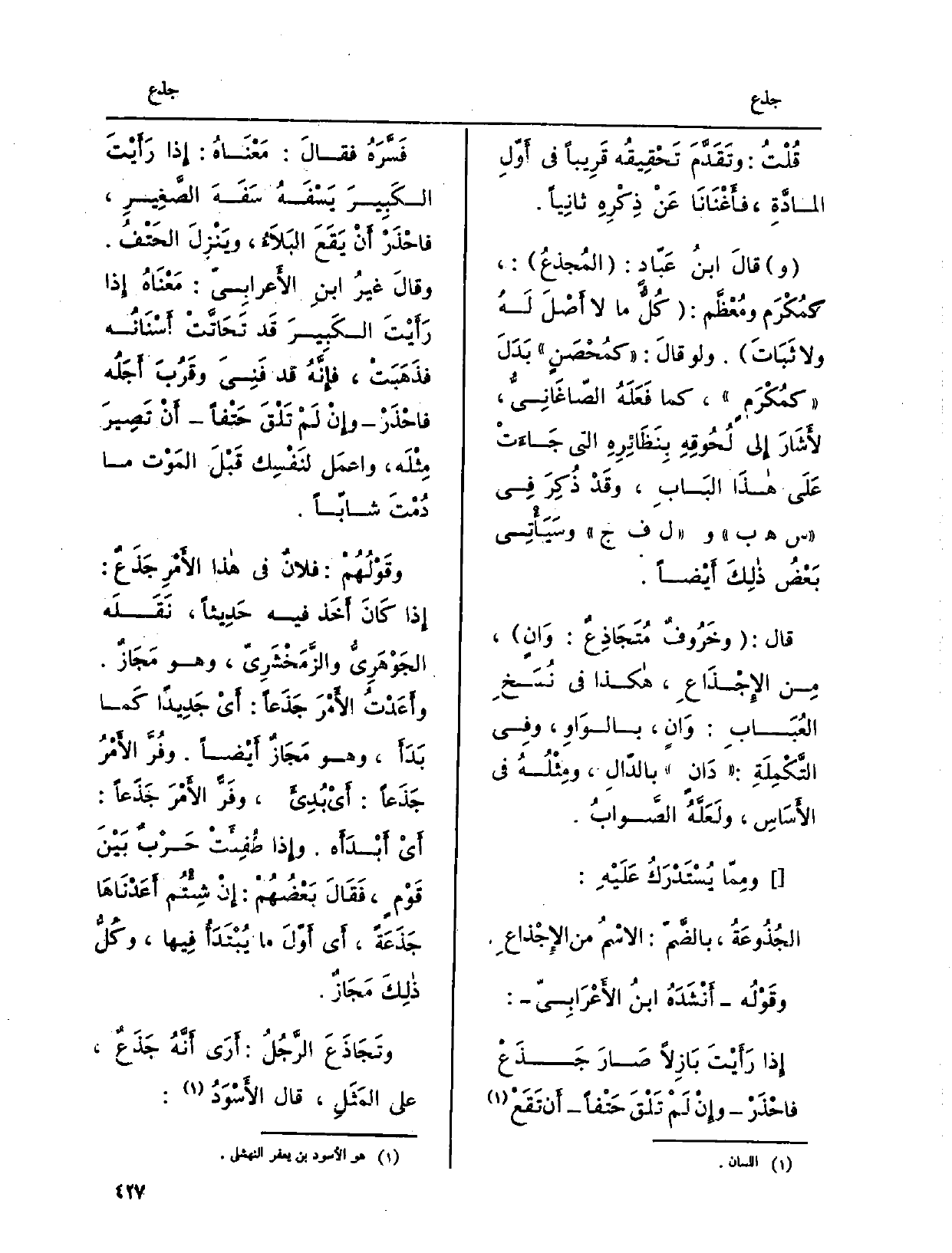 قَالَ: وخَرُوفٌ مُتَجَاذِعٌ: وَانٍ، مِن الإِجْذَاعِ، هَكَذَا فِي نُسَخِ العُبَابِ: وَانٍ، بالوَاوِ، وفِي التَّكْمِلَةِ: دَانٍ بالدّالِ، ومِثْلُهُ فِي الأَسَاسِ، ولَعَلَّهُ الصَّوابُ. ومِمّا يُسْتَدْرَكُ عَلَيْهِ: الجُذُوعَةُ، بالضَّمّ: الاسْمُ من الإِجْذاعِ. وقَوْلهُ أَنْشَدَهُ ابنُ الأَعْرَابِيّ: إِذا رَأَيْتَ بَازِلاً صَارَ جَذَعْ فاحْذَرْ وإِنْ لَمْ تَلْقَ حَتْفاً أَن تَقَعْ فَسَّرَهُ فقالَ: مَعْنَاهُ: إِذا رَأَيْتَ الكَبِيرَ يَسْفَهُ سَفَهَ الصَّغِيرِ، فاحْذَرْ أَنْ يَقَعَ البَلاَءُ، ويَنْزِلَ الحَتْفُ.