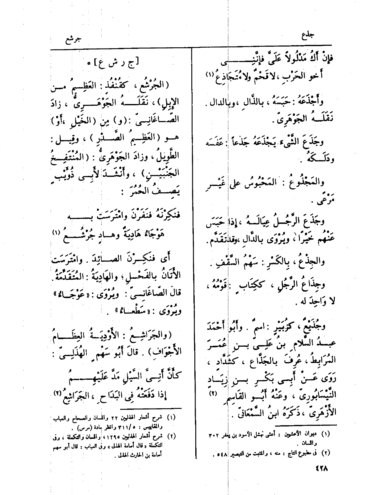 أَي فنَكِرْنَ الصائِدَ. وامْتَرَسَت الأَتَانُ بالفَحْلِ، والهَادِيَةُ: المُتَقَدِّمَةً. قَالَ الصّاغَانِيّ: ويُرْوَى: عَوْجَاءُ ويُرْوَى: سَطْعاءُ. والجَرَاشِعُ: الأَوْدِيَةُ العِظَامُ الأَجْوَافِ. قالَ أَبُو سَهْمٍ الهُذَلِيّ: