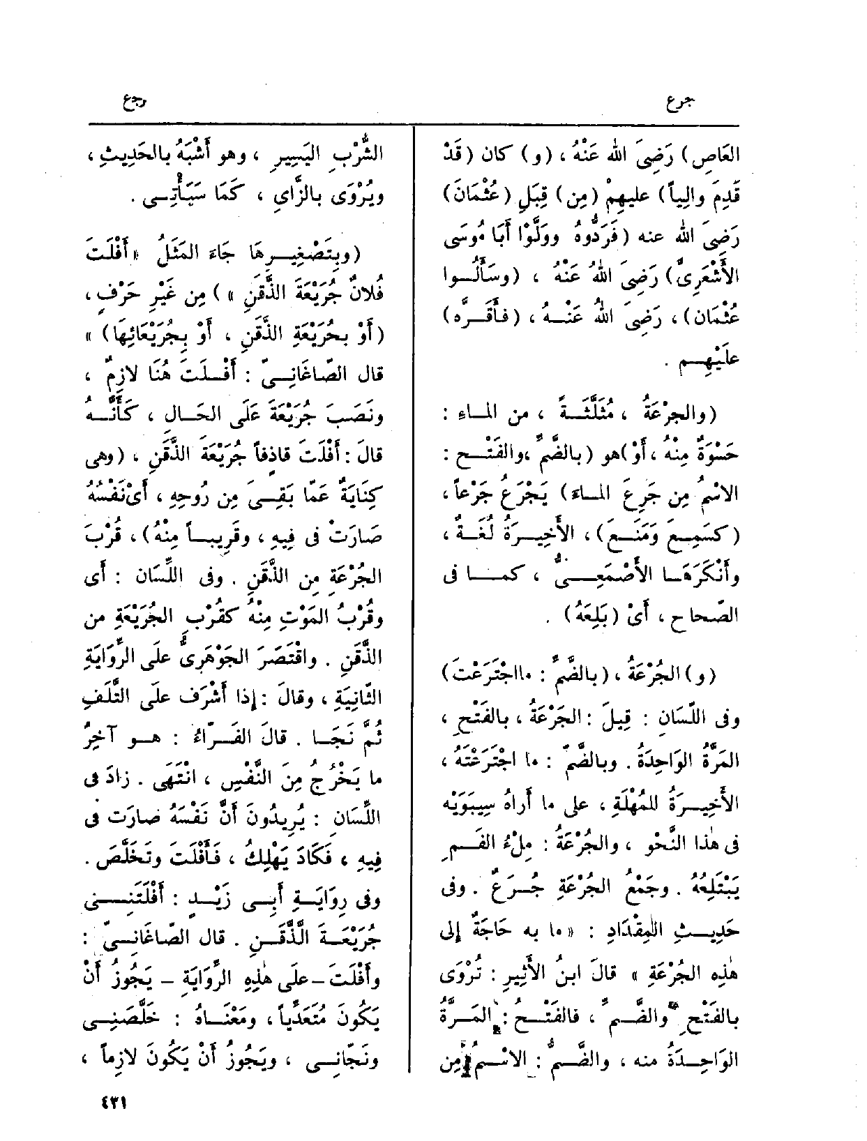 وجَمْعُ الجُرْعَةِ جُرَعٌ. وَفِي حَدِيثِ المِقْدَادِ: مَا بِهِ حَاجَةٌ إِلى هذِه الجُرْعَةِ قالَ ابنُ الأَثِيرِ: تُرْوَى بالفَتْحِ والضَّمِّ، فالفَتْحُ: المَرَّةُ الوَاحِدَةُ مِنْهُ، والضَّمُّ: الاسْمُ مِن الشُّرْبِ اليَسِيرِ، وَهُوَ أَشْبَهُ بالحَدِيثِ، ويُرْوَى بالزَّايِ، كَمَا سَيَأْتِي.