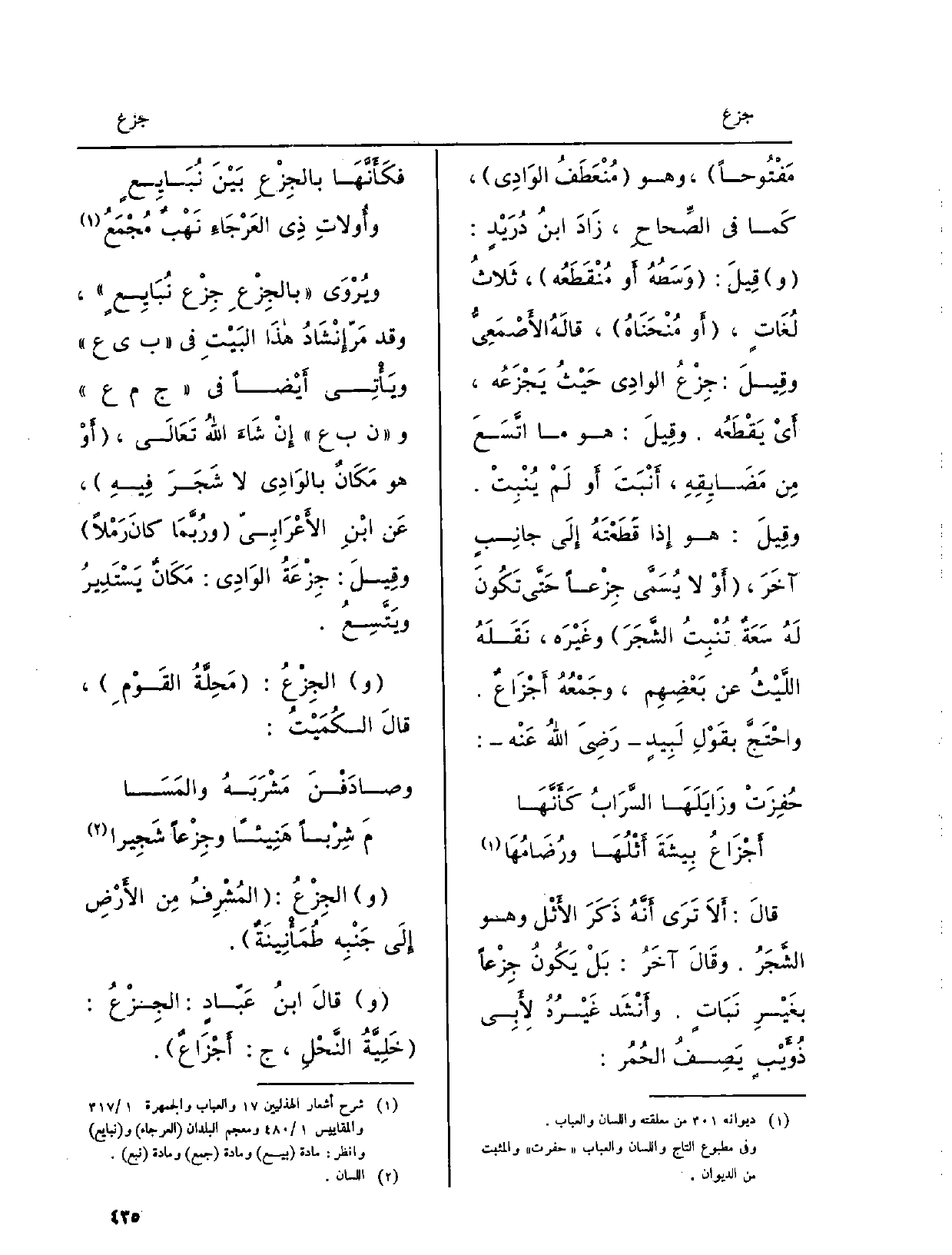 وقِيلَ: هُوَ مَا اتَّسَعَ مِن مَضَايِقِهِ، أَنْبَتَ أَو لَمْ يُنْبِتْ. وقِيلَ: هُوَ إِذا قَطَعْتَهُ إِلَى جانِبٍ آخَرَ، أَوْ لَا يُسَمَّى جِزْعاً حَتَّى تَكُونَ لَهُ سَعَةٌ تُنْبِتُ الشَّجَرَ وغَيْرَه، نَقَلَهُ اللَّيْثُ عَن بَعْضِهِم، وجَمْعُهُ أَجْزَاعٌ.)