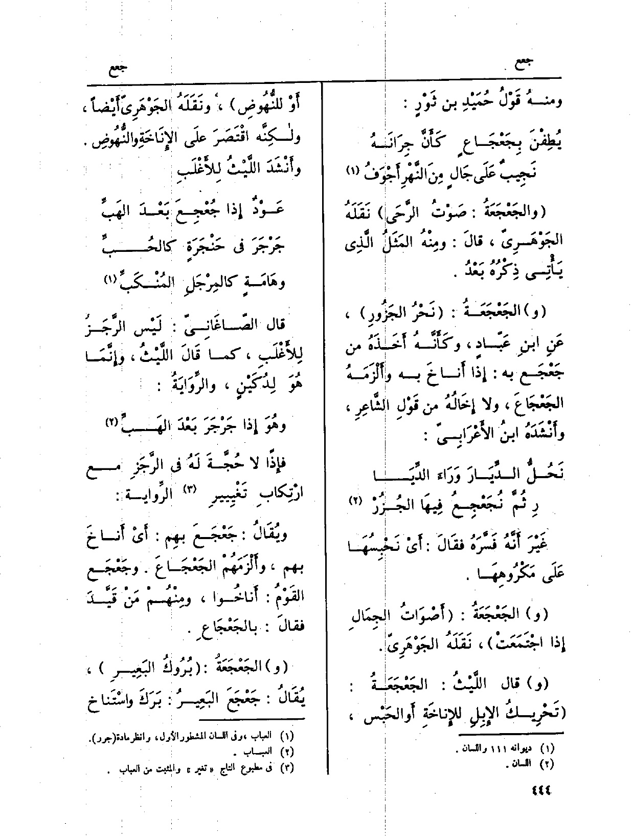 وَقَالَ اللَّيْثُ: الجَعْجَعَةُ: تَحْرِيكُ الإِبِلِ للإِناخَةِ أَو الحَبْس، أَوْ للنُّهُوضِ، ونَقَلَهُ الجَوْهَرِيّ أَيْضاً، ولكِنَّه اقْتَصَرَ علَى الإِنَاخَةِ والنُّهُوضِ. وأَنْشَدَ اللَّيْثُ للأَعْلَبِ: عَوْدٌ إِذا} جُعْجِعَ بَعْدَ الهَبِّ جَرْجَرَ فِي حَنْجَرَةٍ كالحُبِّ وهَامَةٍ كالمِرْجَلِ المُنْكَبِّ قَالَ الصّاغَانِيّ: لَيْس الرَّجَزُ للأَغْلَبِ، كَمَا قَالَ اللَّيْثُ، وإِنَّمَا هُوَ لِدُكّيْنٍ، والرِّوَايَةُ: وهُوَ إِذا جَرْجَرَ بَعْدَ الهَبِّ فإِذاً لَا حُجَّةَ لَهُ فِي الرَّجَزِ مَعَ ارِتْكابِ تَغْييرِ الرِّواية.