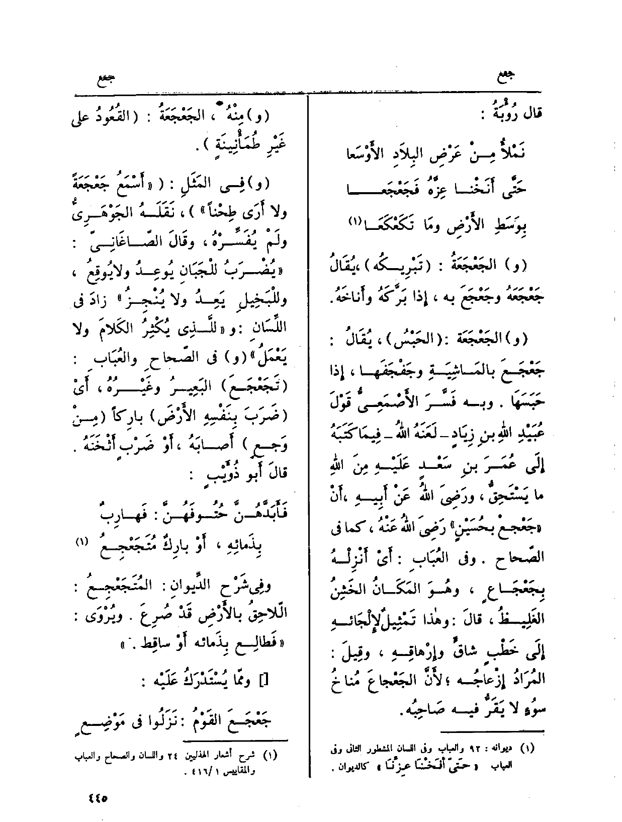 وفِي المَثَلِ: أَسْمَعُ {جَعْجَعَةً وَلَا أَرَى طِحْناً، نَقَلَهُ الجَوْهَرِيُّ ولَمْ يُفَسِّرْهُ، وقَالَ الصّاغَانِيّ: يُضَرَبُ للْجَبَانِ يُوعِدُ ولايُوقِعُ، وللْبَخِيلِ يَعِدُ وَلَا يُنْجِزُ زادَ فِي اللِّسَانِ: وللَّذِي يَكْثِرُ الكَلامَ وَلَا يَعْمَلُ وَفِي الصّحاحِ والعُبَابِ:} تَجَعْجَعَ البَعِيرُ وغَيْرُهُ، أَيْ ضَرَبَ بِنَفْسِهِ الأَرْضَ بارِكاً مِنْ وَجعٍ أَصابَهُ، أَوْ ضَرْبٍ أَثْخَنَهُ. قالَ أَبو ذُؤَيْبٍ: