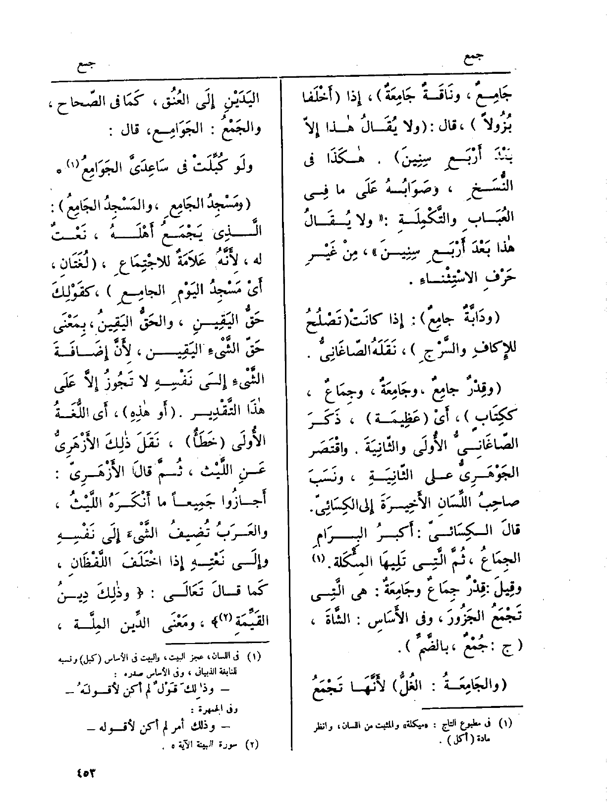 وقِدْرٌ جامِعٌ، وجَامِعَةٌ، وجِمَاعٌ، ككِتَابٍ، أَيْ عَظِيمَة، ذَكَرَ الصّاغَانِيُّ الأُولَى والثّانِيَةَ. واقْتَصَرَ الجَوْهَرِيُّ على الثّانِيَةَ. ونَسَبَ صاحِبُ اللِّسَانِ الأَخِيرَةَ إِلى الكِسَائِيّ. قالَ الكِسَائيّ: أَكبرُ البِرَامِ الجِمَاعُ، ثُمَّ الَّتِي تَلِيهَا المِئْكَلة. وقِيلَ: قِدْرٌ جِمَاعٌ وجَامِعَةٌ: هِيَ الَّتِي تَجْمَعُ الجَزُورَ، وَفِي الأَسَاسِ: الشَّاةَ، ج: جُمْعٌ، بالضَّمِّ. والجَامِعَةُ: الغُلُّ لأَنَّهَا تَجْمَعُ اليَدَيْنِ إِلَى العُنُق، كَمَا فِي الصّحاح، والجَمْعُ: الجَوَامِع، قَالَ: ولَو كُبِّلَتْ فِي سَاعِدَيَّ الجَوَامِعُ ومَسْجِدُ الجَامِعِ، والمَسْجِدُ الجَامِعُ: الَّذِي يَجْمَعُ أَهْلَهُ، نَعْتٌ لَهُ، لأَنَّهُ عَلاَمَةٌ للاجْتِمَاعِ، لُغَتَانِ، أَيْ مَسْجِدُ اليَوْمِ الجامِعِ، كقَوْلِكَ حَقُّ اليَقِينِ، والحَقُّ اليَقِينُ، بِمَعْنَى حَقّ الشَّيْءِ اليَقِين، لأَنَّ إِضَافَةَ الشَّيْءِ إِلَى نَفْسِهِ لَا تَجُوزُ إِلاَّ عَلَى هذَا التَّقْدِير. أَو هذِهِ، أَي اللُّغَةُ الأُولَى خَطَأٌ، نَقَلَ ذلِكَ الأَزْهَرِيّ عَنِ اللَّيْث، ثُمَّ قالَ الأَزْهَرِيّ: أَجازُوا جَمِيعاً مَا أَنْكَرَهُ اللَّيْثُ، والعَرَبُ تُضِيفُ الشَّيْءَ إِلَى نَفْسِهِ وإِلَى نَعْتِهِ إِذا اخْتَلَفَ اللَّفْظَانِ، كَما قالَ تَعَالَى: وذلِكَ دِينُ القَيِّمَةِ، ومَعْنَى الدِّين المِلَّة،