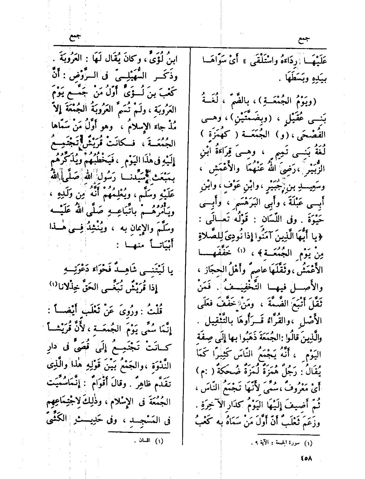 ويَوْمُ الجُمْعَةِ، بالضَّمّ، لُغَةُ بَنِي عُقَيْلٍ، وبِضَمَّتَيْنِ، وَهِي الفُصْحَى، والجُمَعَة كهُمَزَةٍ لُغَةُ بَني تَمِيمٍ، وهِيَ قِرَاءَةُ ابْنِ الزُّبَيْرِ، رَضِيَ اللهُ عَنْهُمَا والأَعْمَشِ، وسَعِيدِ بنِ جُبَيْرٍ، وابْنِ عَوْفٍ، وابْنِ أَبِي عبْلَةَ، وأَبِي البَرَهْسَمِ، وأَبِي حَيْوَةَ. وَفِي اللّسَانِ: قَوْلُه تَعالَى: يَا أَيُّهَا الَّذِينَ آمَنُوا إِذا نُودِيَ لِلصَّلاةِ مِنْ يَوْمِ الجُمْعَةِ، خَفَّفَها الأَعْمَشُ، وثَقَّلَهَا عاصِمٌ وأَهْلُ الحِجَاز، والأَصل فِيهَا التَّخْفِيفُ. فَمَنْ ثَقَّلَ أَتْبَعَ الضَّمَّةَ، ومَنْ خَفَّفَ فعَلَى الأَصْلِ، والقُرَّاءُ قَرَأُؤهَا بالتَّثْقِيل.