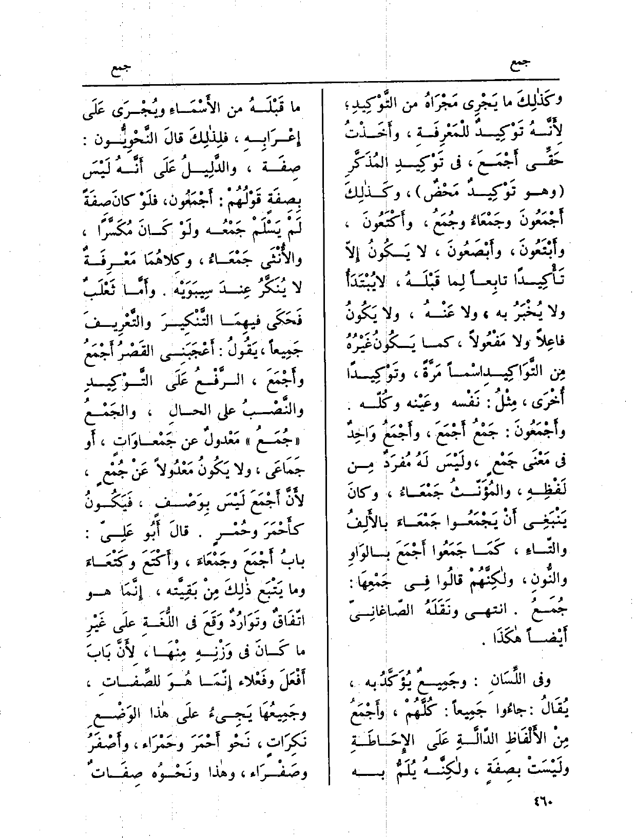 وكَذلِكَ مَا يَجْرِي مَجْرَاهُ من التَّوْكِيدِ، لأَنَّهُ تَوْكِيدٌ للْمَعْرِفَةِ، وأَخَذْتُ حَقِّي أَجْمَعَ، فِي تَوْكِيدِ المُذَكَّرِ وَهُوَ تَوْكِيدٌ مَحْضٌ، وكَذلِكَ أَجْمَعُونَ وجَمْعَاءُ وجُمَعُ، وكَذلِكَ أَجْمَعُونَ وجَمْعَاءُ وجُمْعُ، وأَكْتَعُونَ، وأَبْتَعُونَ، وأَبْصَعُونَ، لَا يَكُونُ إِلاّ تَأْكِيداً تابِعاً لِما قَبْلَهُ، لَا يُبْتَدَأُ وَلَا يُخْبَرُ بِهِ، وَلَا عَنْهُ، وَلَا يَكُونُ فاعِلاً وَلَا مَفْعُولاً، كَمَا يَكُونُ غَيْرُهُ مِن التَّوَاكِيدِ اسْماً مَرَّةً، وتَوْكِيداً أُخْرَى، مِثْلُ: نَفْسه وعَيْنه وكُلّه. وأَجْمَعُونَ: جَمْعُ أَجْمَعَ، وأَجْمَعَ وَاحِدٌ فِي مَعْنَى جَمْعٍ، ولَيْسَ لَهُ مُفرَدٌ مِن لَفْظِهِ، والمُؤَنّثُ جَمْعَاءُ، وكانَ يَنْبَغِي أَنْ يَجْمَعُوا جَمْعَاءَ بالأَلِفُ والتّاءِ، كَمَا جَمَعُوا أَجْمَعَ بالوَاوِ والنُّونِ، ولكِنُّهُمْ قالُوا فِي جَمْعِهَا: جُمَعُ.