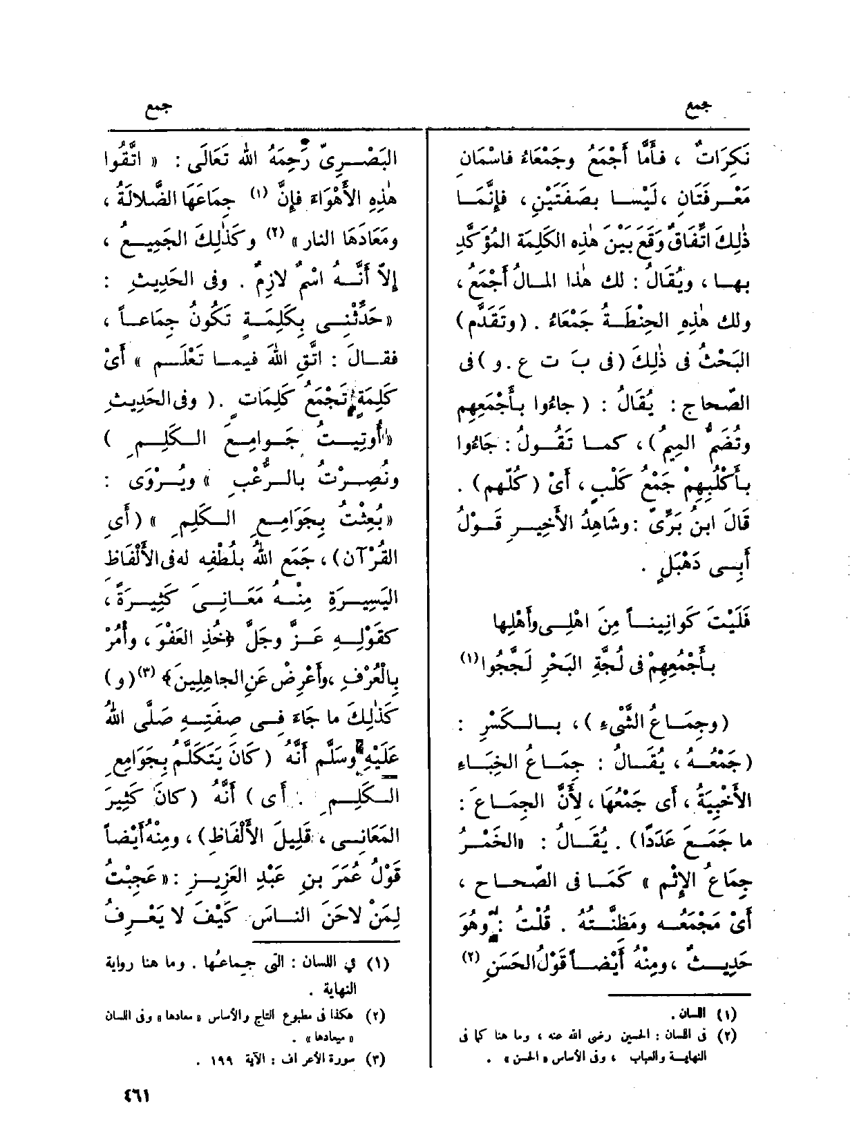وجِمَاعُ الشَّيْءِ، بالكَسْرِ: جَمْعُهُ، يُقَالُ: جِمَاعُ الخِبَاءِ الأَخْبِيَةُ، أَي جَمْعَهَا، لأَنَّ الجِمَاعَ: مَا جَمَعَ عَدَداً. يُقَالُ: الخَمْرُ جِمَاعُ الإِثْم كَمَا فِي الصّحاح، أَيْ مَجْمَعُه ومَظِنَّتُهُ قُلْتُ: وهُوَ حَدِيثٌ، ومِنْهُ أَيْضاً قَوْلُ الحَسَنِ البَصْرِيّ رَحِمَهُ الله تَعَالَى: اتَّقُوا هذِهِ الأَهْوَاءَ فإِنَّ جِمَاعَهَا الضَّلالَةُ، ومَعَادَهَا النَّار وكَذلِكَ الجَمِيعُ، إِلاّ أَنَّهُ اسْمٌ لازِمٌ. وَفِي الحَدِيثِ: حَدِّثْنِي بِكَلِمَةٍ تَكُونُ جِمَاعاً، فقالَ: اتَّقِ اللهَ فِيمَا تَعْلَم أَيْ كَلِمَةٍ تَجْمَعُ كَلِمَاتٍ. وَفِي الحَدِيثِ أُوتِيتُ جَوامِعَ الكَلِمِ ونُصِرْتُ بالرُّعِبِ ويُرْوَى: بُعِثْتُ بِجَوَامِعِ الكَلِمِ أَي القُرْآن، جَمَع اللهُ بلُطْفِه لَهُ فِي الأَلْفَاظِ اليَسِيرَةِ مِنْهُ مَعَانيَ كَثِيرَةً، كقَوْلِهِ عَزَّ وجَلَّ خُذِ العَفْوَ، وأْمُرْ بِالْعُرْفِ، وأَعْرِضْ عَنِ الجاهِلِينَ وكَذلِكَ مَا جَاءَ فِي صِفَتِهِ صَلَّى اللهُ عَلَيْهِ وسَلَّم أَنَّهُ كَانَ يَتَكَلَّمُ بِجَوَامِعِ الكَلِمِ. أَي أَنَّهُ كانَ كَثِيرَ المَعَانِي، قَلِيلَ الأَلْفَاظِ، ومِنْهُ أَيْضاً قُوْلُ عُمَرَ بنِ عَبْدِ العَزِيزِ: عَجِبْتُ لِمَنْ لاحَنَ الناسَ كَيْفَ لايَعْرِفُ