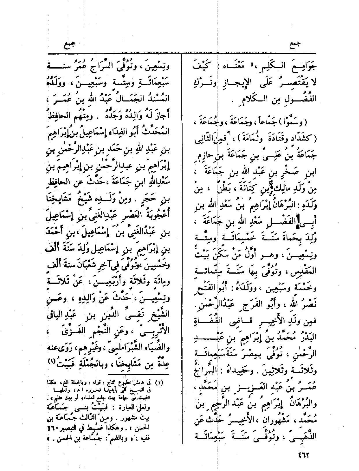 وسَمَّوْه جَمّاعاً، وجَمَاعَةَ، وجُمَاعَةَ، كشَدّادٍ وقَتَادَةَ وثُمَامَةَ، فمِنَ الثّانِي جَمَاعَةُ بنُ عَلِيِّ بنِ جَمَاعَةَ بنِ حازِمِ ابنِ صَخرِ بنِ عَبْدِ اللهِ بنِ جَمَاعَةَ، مِنْ وَلَدِ مالِكِ بنِ كِنَانَةَ، بَطْنٌ، مِنْ وَلَدَهِ: البُرْهَانُ إِبْرَاهِيمُ بنُ سَعْدِ اللهِ بنِ أَبِي الفَضْلِ سَعْدِ اللهِ بنِ جَمَاعَةَ، وُلِدَ بِحَماةَ سَنَةَ حَمْسِمَائَةٍ وسِتَّةٍ وتِسْعينَ، وَهُوَ أَوَّلُ مَنْ سَكَنَ بَيْتَ المَقْدِسِ، وتُوُفِّيَ بِهَا سَنَةَ سِتّمائةٍ وخَمْسَةٍ وسَبْعِين، ووَلَدَاهُ: أَبُو الفَتْحِ نَصْرُ اللهِ، وأَبُو الفَرَجِ عَبْدُ الرَّحْمنِ. فمِن ولَدِ الأَخِيرِ قاضِي القُضَاةِ البَدْرُ مُحَمَّدُ بنُ إِبْرَاهِيمَ بنِ عَبْدِ الرَّحْمنِ، تُوُفِّيَ بمِصْرَ سَنَةَ سَبْعِمائَة وثَلاثَة وثَلاثِينَ. وحَفِيداهُ: السِّراجُ عُمَرُ بنُ) عَبْدِ العَزِيزِ بنِ مَحَمَّدٍ، والبُرْهَانُ إِبْرَاهِيمُ بنُ عَبْد الرَّحِيم بنِ مُحَمَّدِ، مَشْهُورانِ، الأَخِيرُ حَدَّث عَن الذَّهَبِيّ، وتُوُفِّيَ سَنَةَ سَبْعِمَائَة وتِسْعِينَ، وتُوُفِّيَ السِّرَاجُ عُمَرُ سنة سَبْعِمَائَةِ وسِتَّةٍ وسَبْعِينَ، ووَلَدُهُ المُسْندُ الجَمَالُ عَبْدُ اللهِ بنُ عُمَرَ، أَجازَ لَهُ وَالِدُهُ وَجَدُّهُ. ومِنْهُم الحافِظُ المُحَدِّثُ أَبُو الفِدَاءِ إِسْمَاعِيلُ بنُ إِبْراهِيمَ بنِ عَبْدِ اللهِ بنِ حَمَدِ بنِ عَبْدِ الرَّحْمنِ بنِ إِبْرَاهِيمَ بنِ عبدِ الرَّحِمنِ بنِ إِبْرَاهيمِ بنِ سعْدِ اللهِ ابنِ جَمَاعَةَ، حَدَّثَ عَن الحافِظِ بنِ حَجَرٍ. ومِنْ وَلَدِه شَيْخُ مَشَايخِنَا أُعْجُوبَةُ العِصْرِ عَبْدِ الغَنِيِّ بنِ إِسْمَاعِيلَ بنِ عَبْدُ الغَنِيِّ بنُ إِسْمَاعِيل، بنِ أَحْمَدَ بنِ إِبْرَاهِيم بنِ إِسْمَاعِيل وُلِدَ سَنَةَ أَلْف وخَمْسِينَ، وتُوُفَّيَ فِي آخِرِ شَعْبَانَ سنةَ أَلْفٍ ومِائَةٍ وثَلاثَةٍ وأَرْبَعِينَ، عَنْ ثَلاثَةٍ وتِسْعِينَ، حَدَّثَ عَنْ وَالِدِهِ، وعَنِ الشَّيْخِ تَقِيِّ الدِّينِ بنِ عَبْدِ الْبَاقِي الأَتْرِبِيّ، وعَنِ النَّجْمِ الغَزِّيّ، والضِّيَاءِ الشَّبْرَاملسِيّ، وغَيْرِهِم، رَوَى عَنهُ عِدَّةٌ مِن مَشَايِخِنَا، وبالجُمْلَةِ فَبَيْتُ