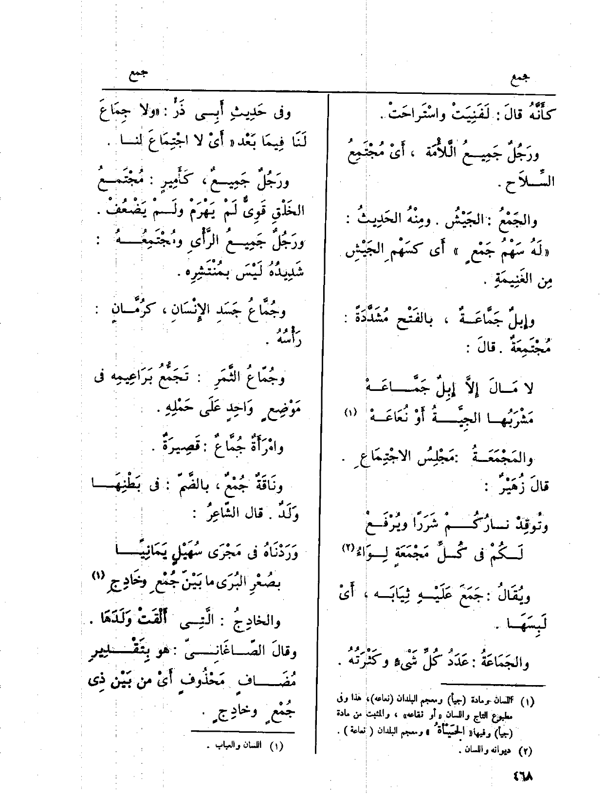 ورَجُلٌ جَمِيعٌ الَّلأْمَة، أَيْ مُجْتَمِعُ السِّلاَح. والجَمْعُ: الجَيْشُ. ومِنْهُ الحَدِيثُ: لَهُ سَهْمُ جَمْعٍ أَي كسَهْمِ الجَيْشِ مِن الغَنِيمَةِ. وإِبلٌ جَمَّاعَةٌ، بالفَتْح مُشَدَّدَةً: مُجْتَمِعَةٌ. قالَ: لَا مَالَ إِلاَّ إِبِلٌ جَمَّاعَهْ مَشْرَبُها الجِيَّةُ أَوْ نُعَاعَهْ والمَجْمَعَةُ: مَجْلِسُ الاجْتِمَاعِ. قالَ زُهَيْرٌ: