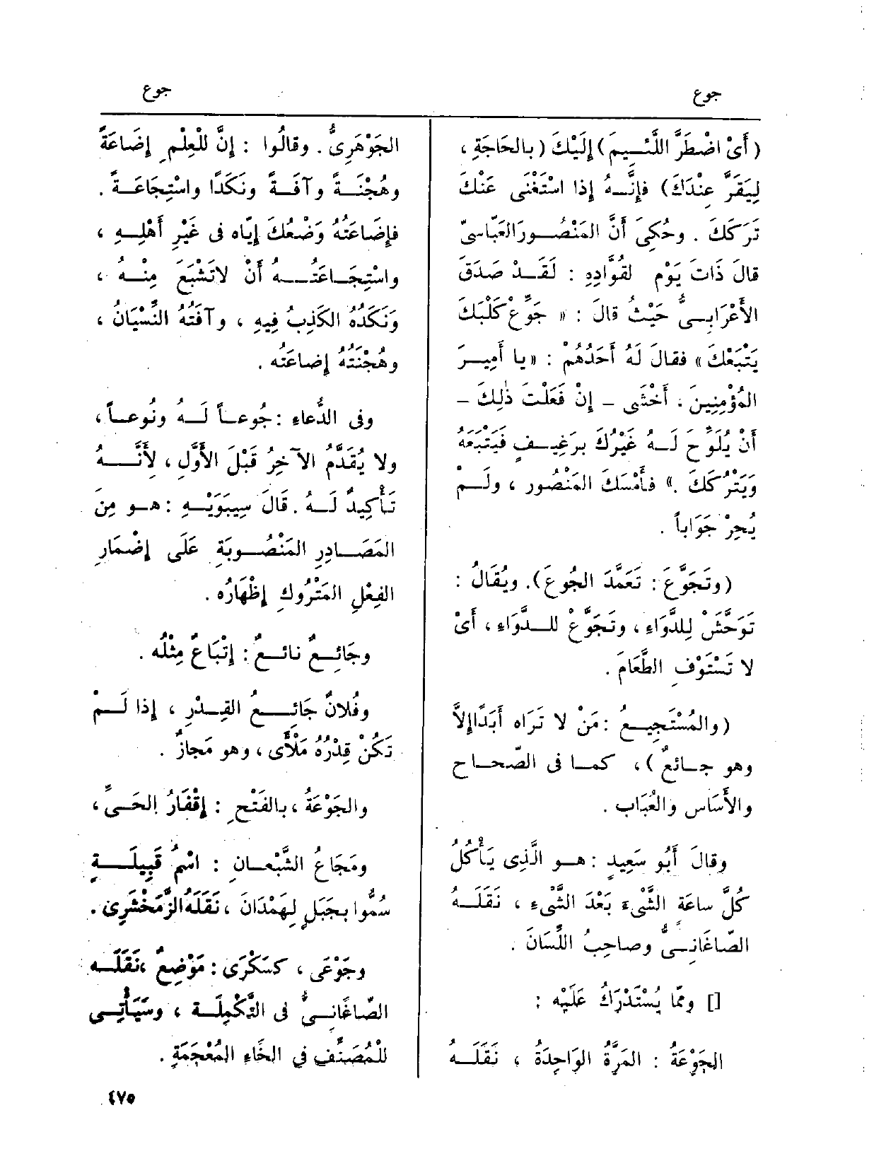 وَفِي الدُّعاءِ:} جُوعاً لَهُ ونُوعاً، وَلَا يُقَدَّمُ الآخِرُ قَبْلَ الأَوَّلِ، لأَنَّهُ تَأْكِيدٌ لَهُ. قَالَ سِيبَوَيْهِ: هُوَ مِنَ المَصَادِرِ المَنْصُوبَةِ عَلَى إِضْمَارِ الفِعْلِ المَتْرُوكِ إِظْهَارُه.