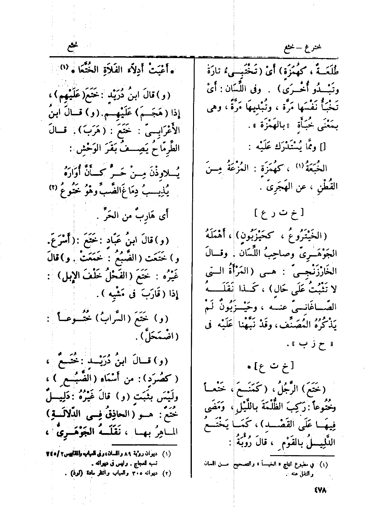 خَتَعَ الرَّجُلَ، كَمَنَعَ، خَتْعاً وخُتُوعاً: رَكِبَ الظُّلْمَةَ باللَّيْلِ، وَمَضَى فِيهَا عَلَى القَصْدِ، كَمَا يَخْتَعُ الدَّلِيلُ بالقَوْمِ، قالَ رُؤْبَةُ: أَعْيَتْ أَدِلاّءَ الفَلاةِ الخُتَّعَا وقالَ ابنُ دُرَيْدٍ: خَتَعَ عَلَيْهِم، إِذا هَجَمَ عَلَيْهِم. وقالَ ابنُ الأَعْرَابِيّ: خَتَعَ: هَرَبَ قالَ الطِّرِمّاحُ يَصِفُ بَقَرَ الوَحْشِ:
