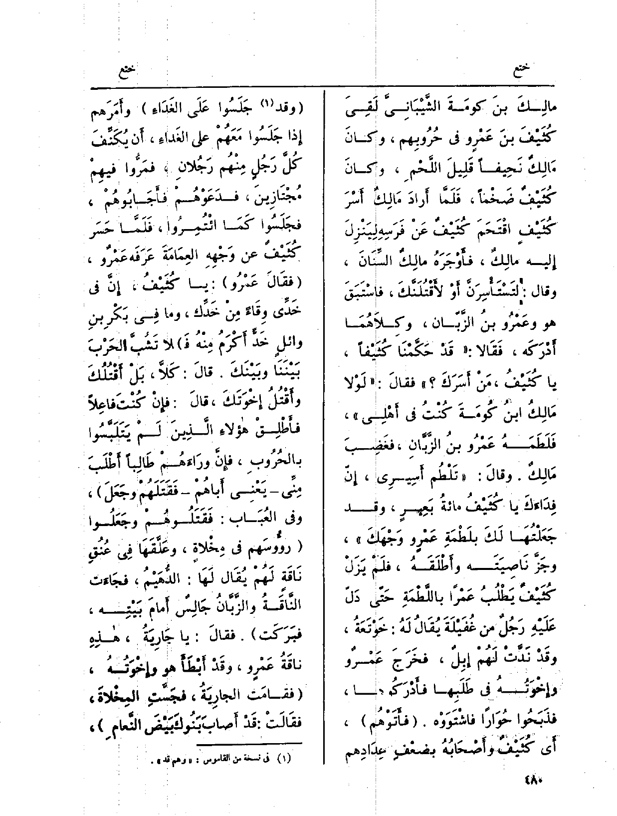 فأَتَوْهُم، أَي كُثَيْفٌ وأَصْحَابُهُ بضعْفِ عِدَادِهم وَقد جَلَسُوا عَلَى الغَدَاءِ وأَمَرَهم إِذا جَلَسُوا مَعَهُمْ على الغَداءِ، أَن يُكَنِّفَ كُلَّ رَجُلٍ مِنْهُم رَجُلانِ، فمَرُّوا فيهِمْ مُجْتَازِينَ، فدَعَوْهُمْ فأَجَابُوهُمْ، فجَلَسُوا كَمَا ائْتُمِرُوا، فَلَمَّا حَسَر كُثَيْفٌ عَن وَجْهِهِ العِمَامَةَ عَرَفَه عَمْروٌ، فقَالَ عَمْرُو: يَا كُثَيْفُ، إِنَّ فِي خَدِّي وِقَاءً مِنْ خَدِّك، وَمَا فِي بَكْرِ بنِ وائلٍ خَدٌّ أَكْرَمُ مِنْهُ فَلا تَشُبَّ الحَرْبَ بَيْنَنَا وبَيْنَكَ.