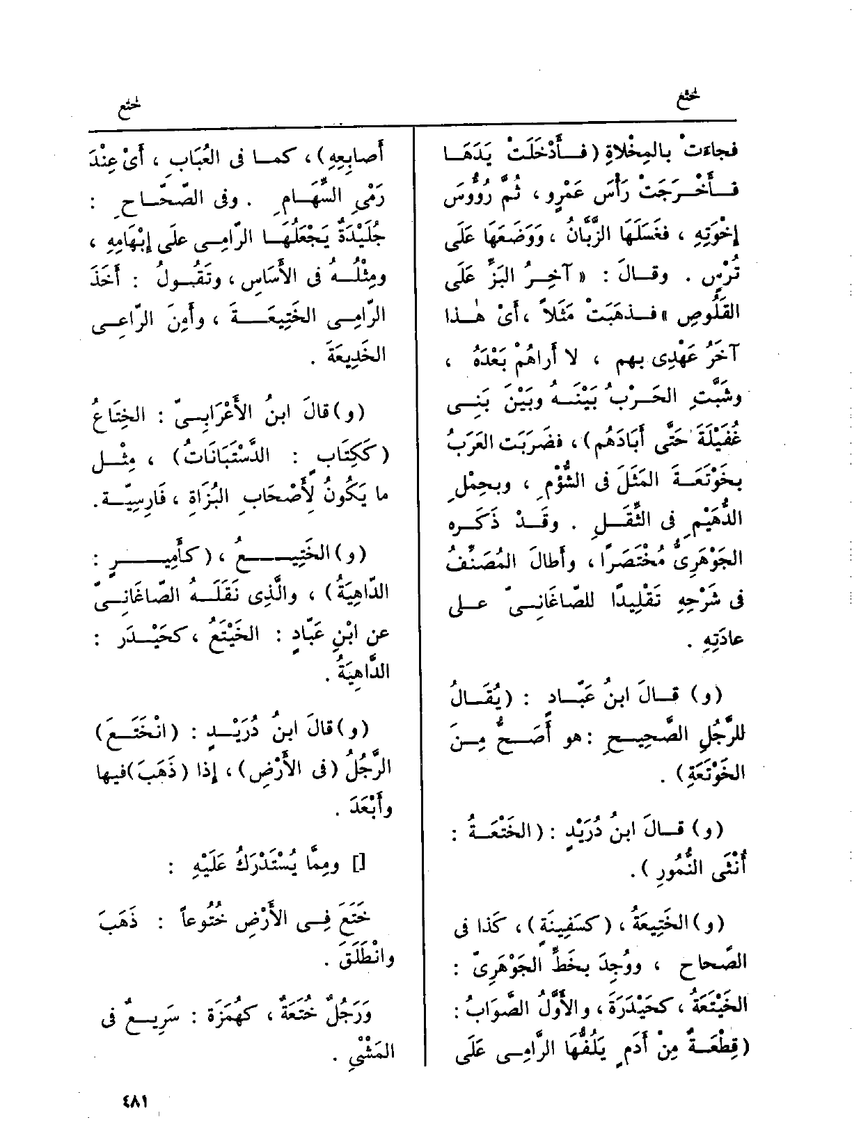 والخَتِيعَةُ، كسَفِينَةٍ، كَذا فِي الصّحاح، ووُجِدَ بخَطِّ الجَوْهَرِيّ: الخَيْتَعَةُ، كحَيْدَرَةَ، والأَوَّلُ الصَّوَابُ: قِطْعَةٌ مِنْ أَدَمٍ يَلُفُّهَا الرَّامِي عَلَى أَصابِعِهِ، كَمَا فِي العُبَابِ، أَيْ عِنَدَ رَمْيِ السِّهَامِ. وَفِي الصّحّاحِ: جُلَيْدَةٌ يَجْعَلُهَا الرّامِي علَى إِبْهَامِهِ، ومِثْلُهُ فِي الأَسَاسِ، وتَقُولُ: أَخَذَ الرّامِي الخَتِيعَةَ، وأَمِنَ الرّاعِي الخَدِيعَةَ.