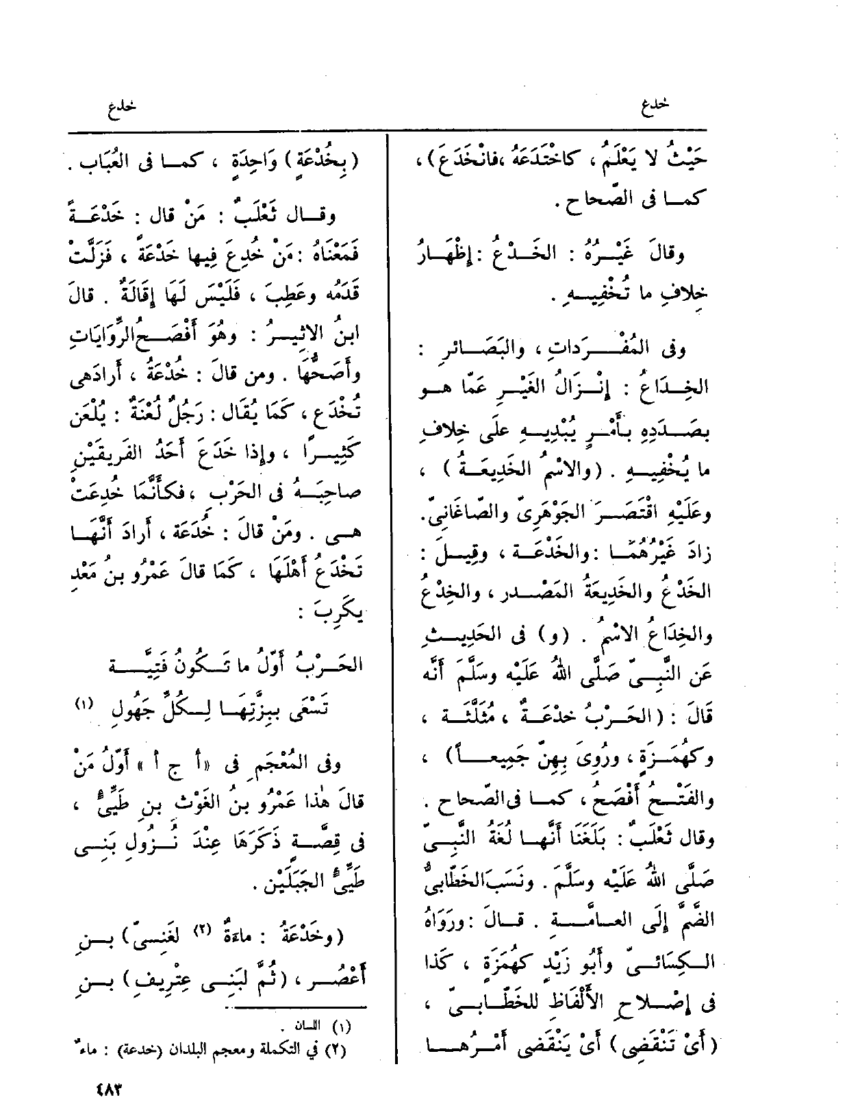 وَفِي المُفْرَداتِ، والبَصَائرِ: الخِدَاعُ: إِنْزَالُ الغَيْرِ عَمّا هُوَ بصَدَدِهِ بأَمْرٍ يُبْدِيهِ علَى خِلافِ مَا يُخْفِيهِ. والاسْمُ الخَدِيعَةُ، وعَلَيْهِ اقْتَصَرَ الجَوْهَرِيّ والصّاغَانِيّ. زادَ غَيْرُهُمَا: والخَدْعَة، وقِيلَ: الخَدْعُ والخَدِيعَةُ المَصْدر، والخِدْعُ والخِدَاعُ الاسْمُ. وَفِي الحَدِيثِ عَن النَّبِيّ صَلَّى اللهُ عَلَيْه وسَلَّمَ أَنَّه قَالَ: الحَرْبُ خدْعَةٌ، مُثَلَّثَة، وكهُمَزَةٍ، ورُوِيَ بِهِنّ جَمِيعاً، والفَتْحُ أَفْصَحُ، كَمَا فِي الصّحاح.
