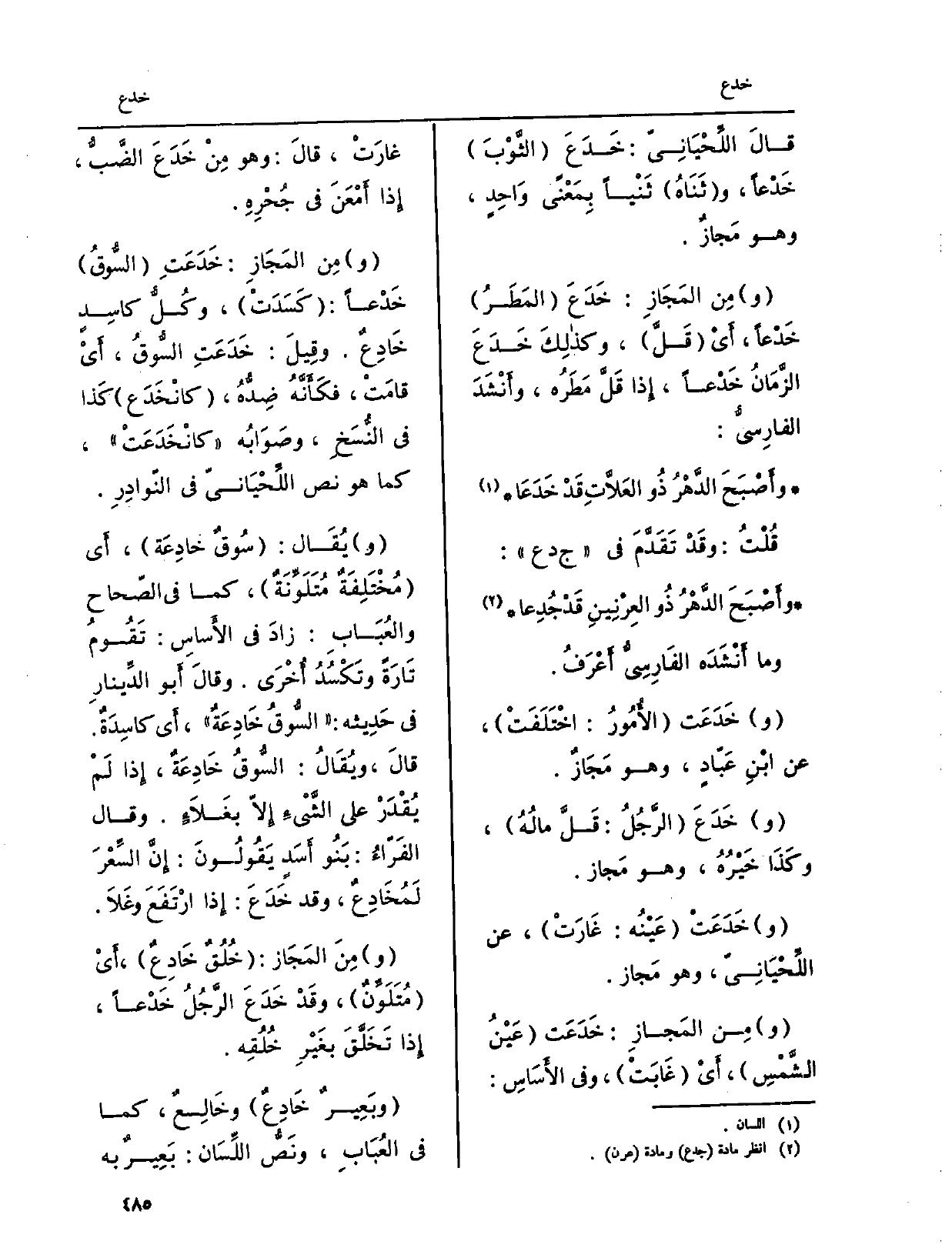ومِنَ المَجَازِ: خَدَعَتِ السُّوقُ خَدْعاً: كَسَدَتْ، وكُلُّ كاسِدٍ خَادِعٌ. وقِيلَ: خَدَعَتِ السُّوقُ، أَيْ قامَتْ، فكَأَنَّهُ ضِدُّهُ، كانْخَدَعَ كَذا فِي النُّسَخِ، وصَوَابُه كانْخَدَعَتْ، كَمَا هُوَ نَص اللِّحْيَانِيّ فِي النّوادِرِ.