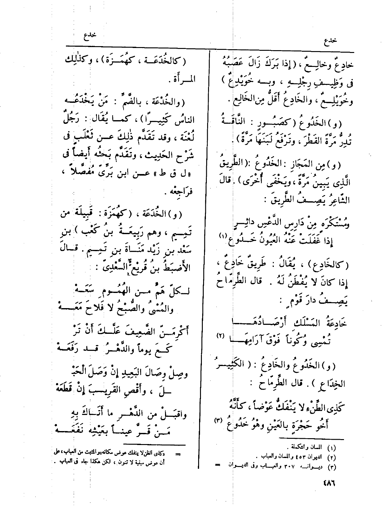 كالخَادِع، يُقَالُ: طَرِيقٌ خَادِعٌ، إِذا كانَ لَا يُفْطَنُ لَهُ. قَالَ الطِّرِمّاحُ يَصِفُ دارَ قَوْمٍ: