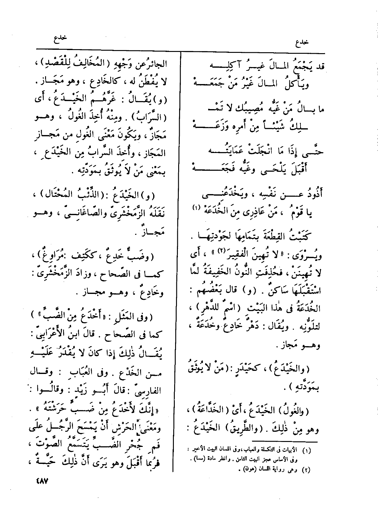 ويُرْوَى: لَا تُهِينَ الْفِقِيرَ أَي لَا تُهِينَنْ، فحُذِفَتِ النُّونُ الخَفِيفَةُ لمَّا اسْتَقْبَلَهَا سَاكنٌ. وَقَالَ بَعْضُهُم: الخُدَعَةُ فِي هَذَا البَيْتِ اسْمٌ للدَّهْرِ، لتلَوُّنِه. ويُقَال: دَهْرٌ خَادِعٌ وخُدَعَةٌ، وَهُوَ مَجاز.