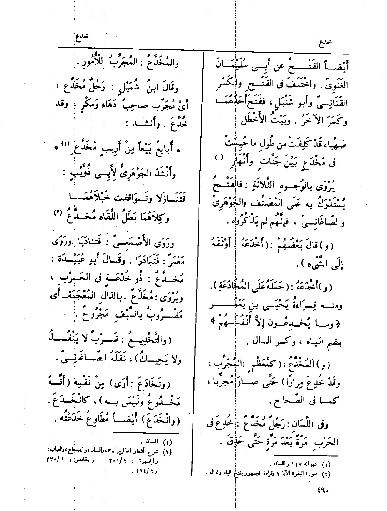 ورَوَى الأَصْمَعِيّ: فَتنادَيَا. ورَوَى مَعْمَرٌ: فَتَبَادَرَا. وقَالَ أَبو عُبَيْدَة: مُخدَّعٌ: ذُو خُدْعَةٍ فِي الحَرْبِ، ويُرْوَى: مُخَذَّعٌ بالذالِ المُعْجَمَة أَي مَضْرُوبٌ بالسَّيْفِ مَجْرُوحٌ.
