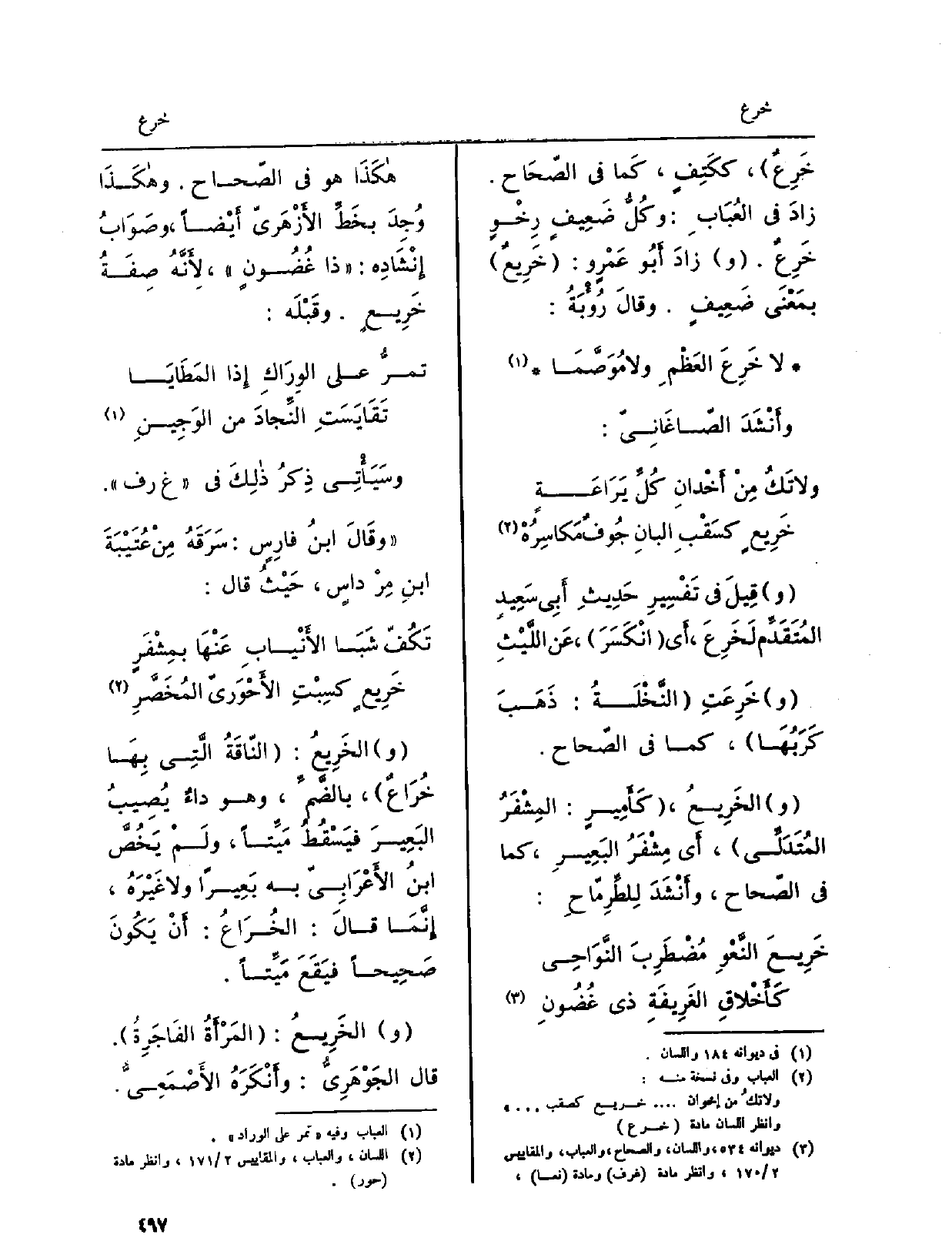 وقِيلَ فِي تَفْسِيرِ حَدِيثِ أِبِي سَعِيدٍ المُتَقَدِّم لَخَرِعَ، أَي انْكَسَرَ، عَن اللَّيْثِ وخَرِعَتِ النَّخْلَةُ: ذَهَبَ كَرَبُهَا، كَمَا فِي الصّحاح.